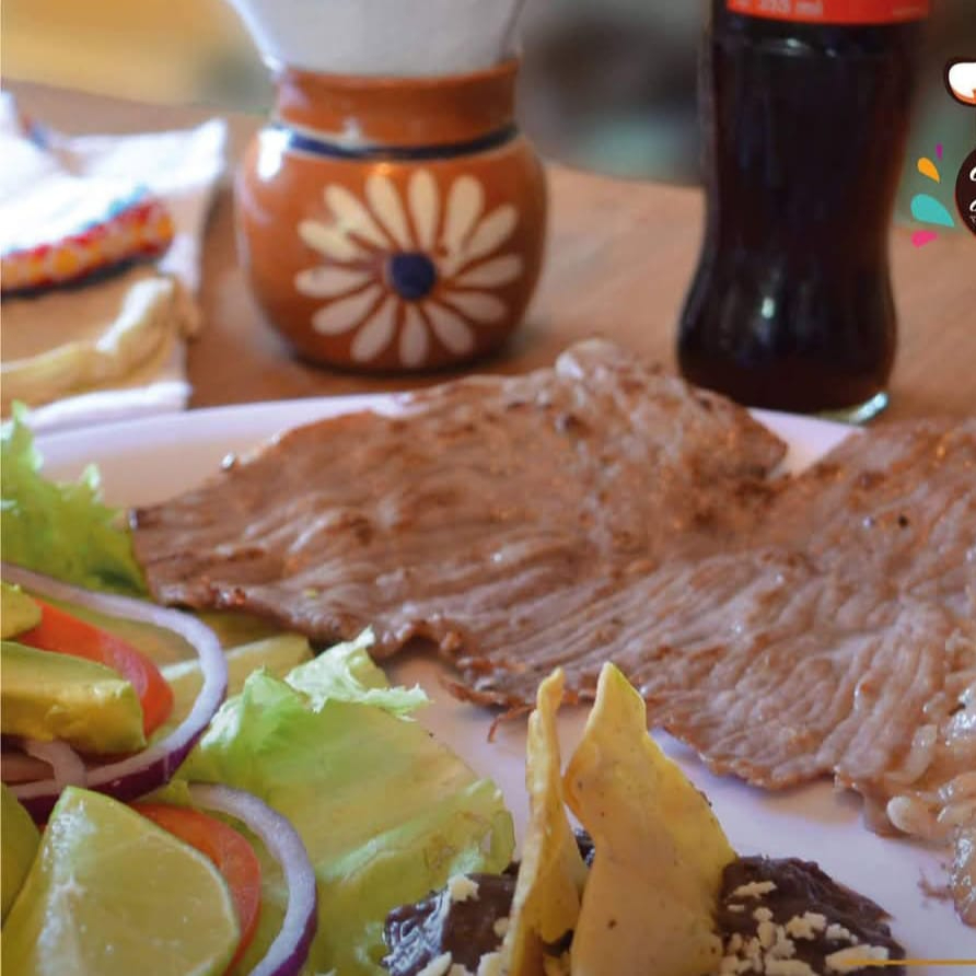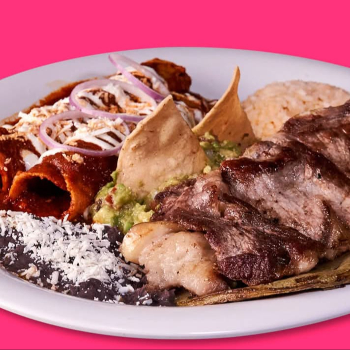 Acompañados de guacamole, frijoles refritos, arroz, 2 enchiladas (verde y rojas), una porción de nopal.