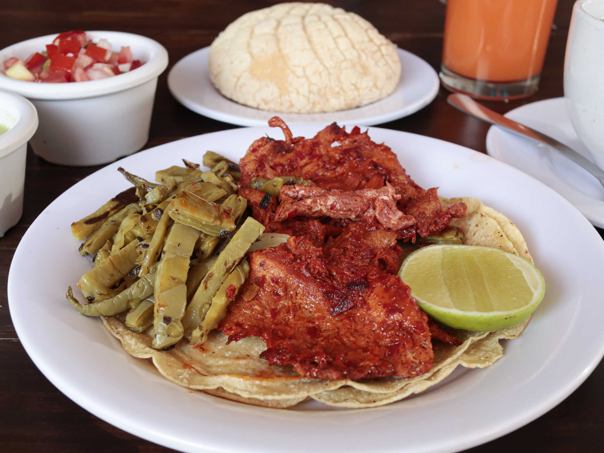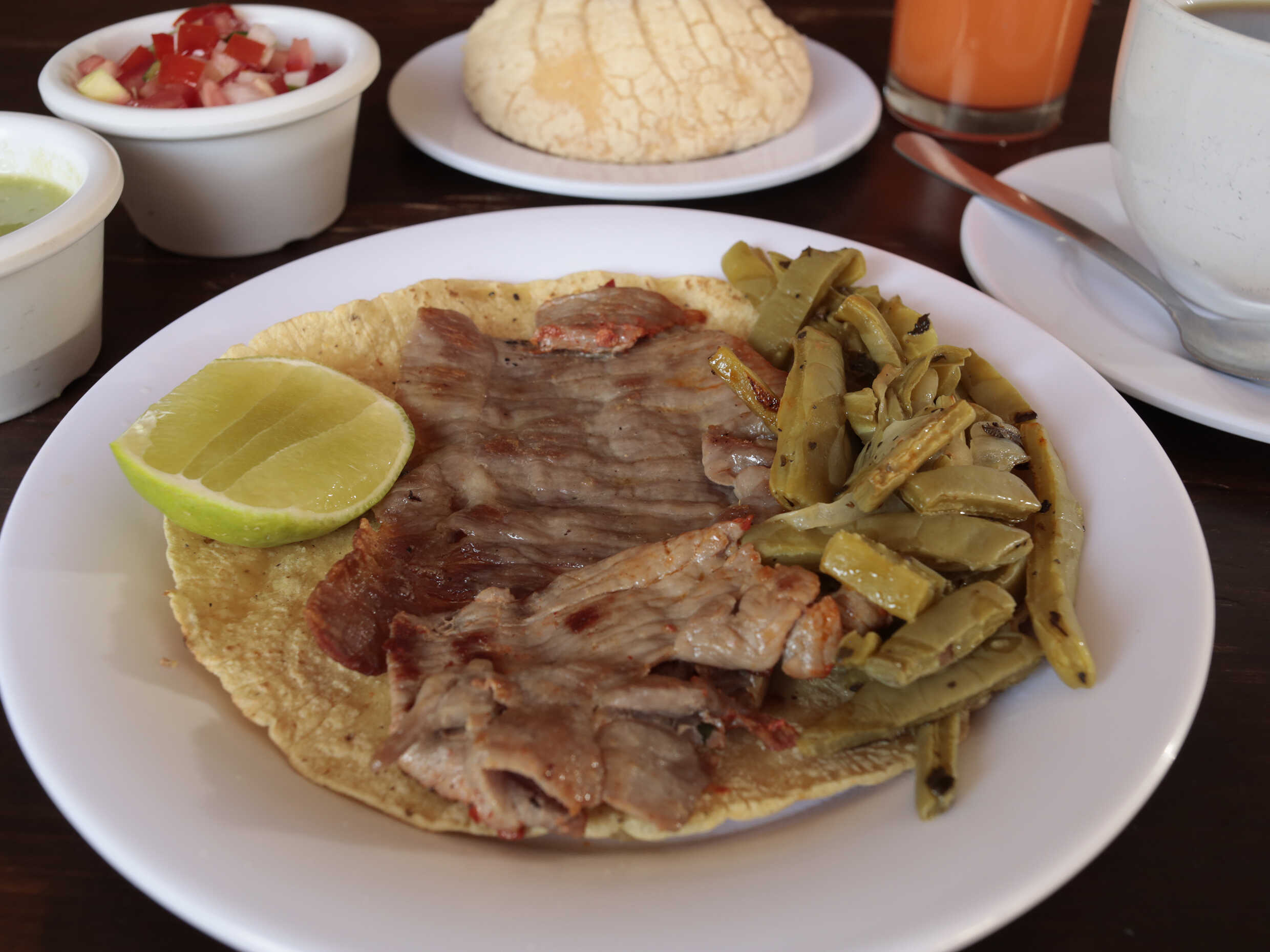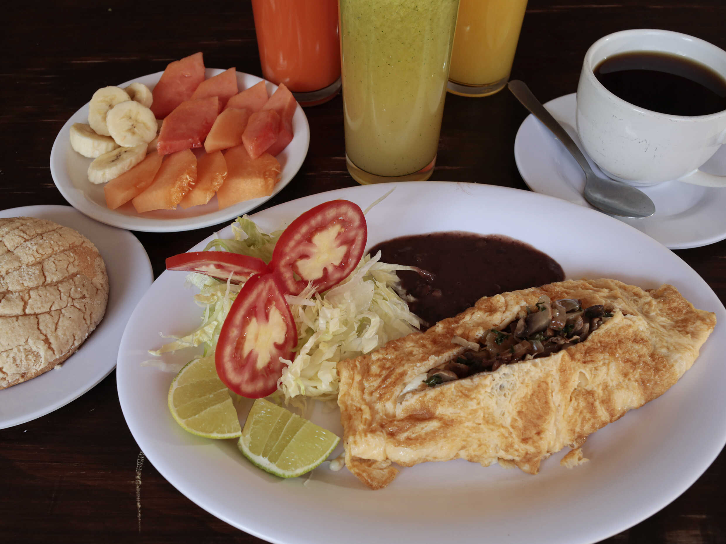 Incluye: Café o té, pieza de pan y agua fresca o jugo o fruta de temporada. Acompañadas de frijoles y 1 telera.