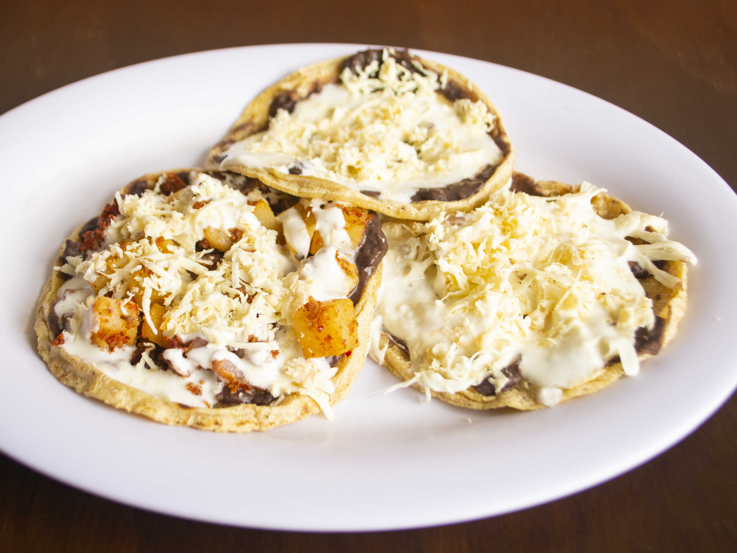 Base de frijol, crema, queso y el guisado.