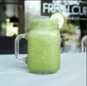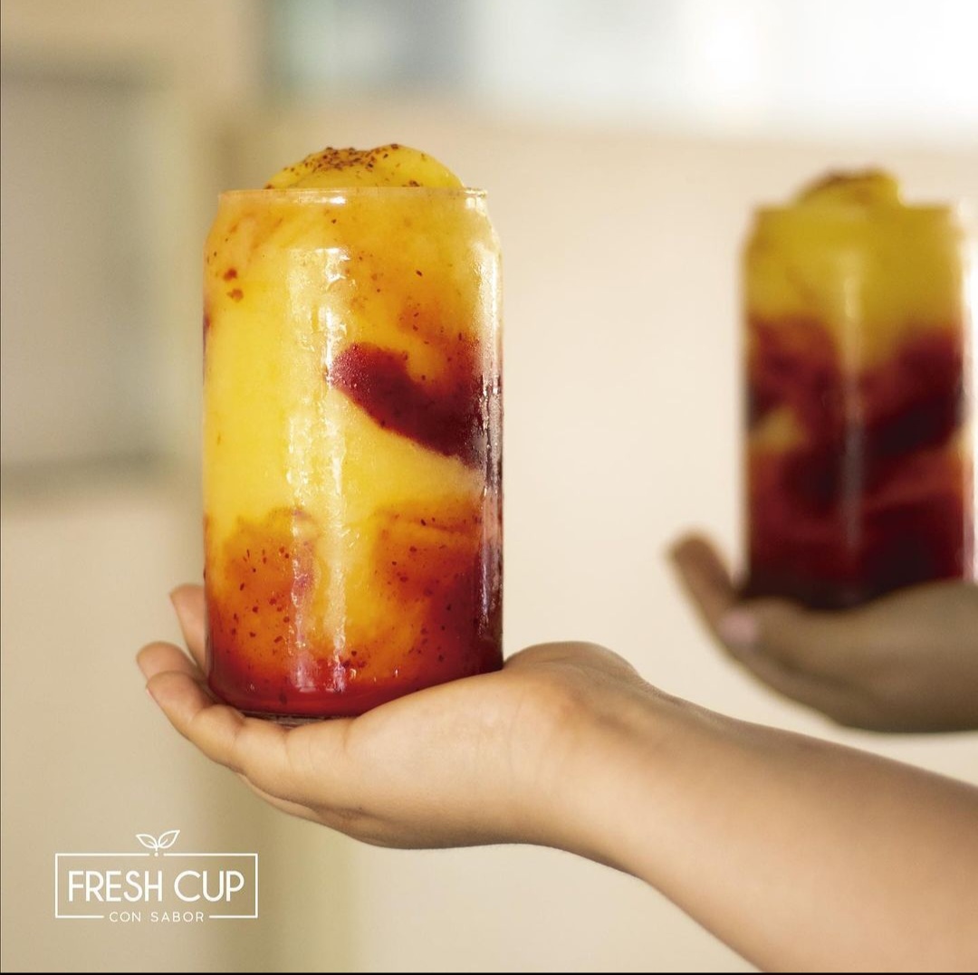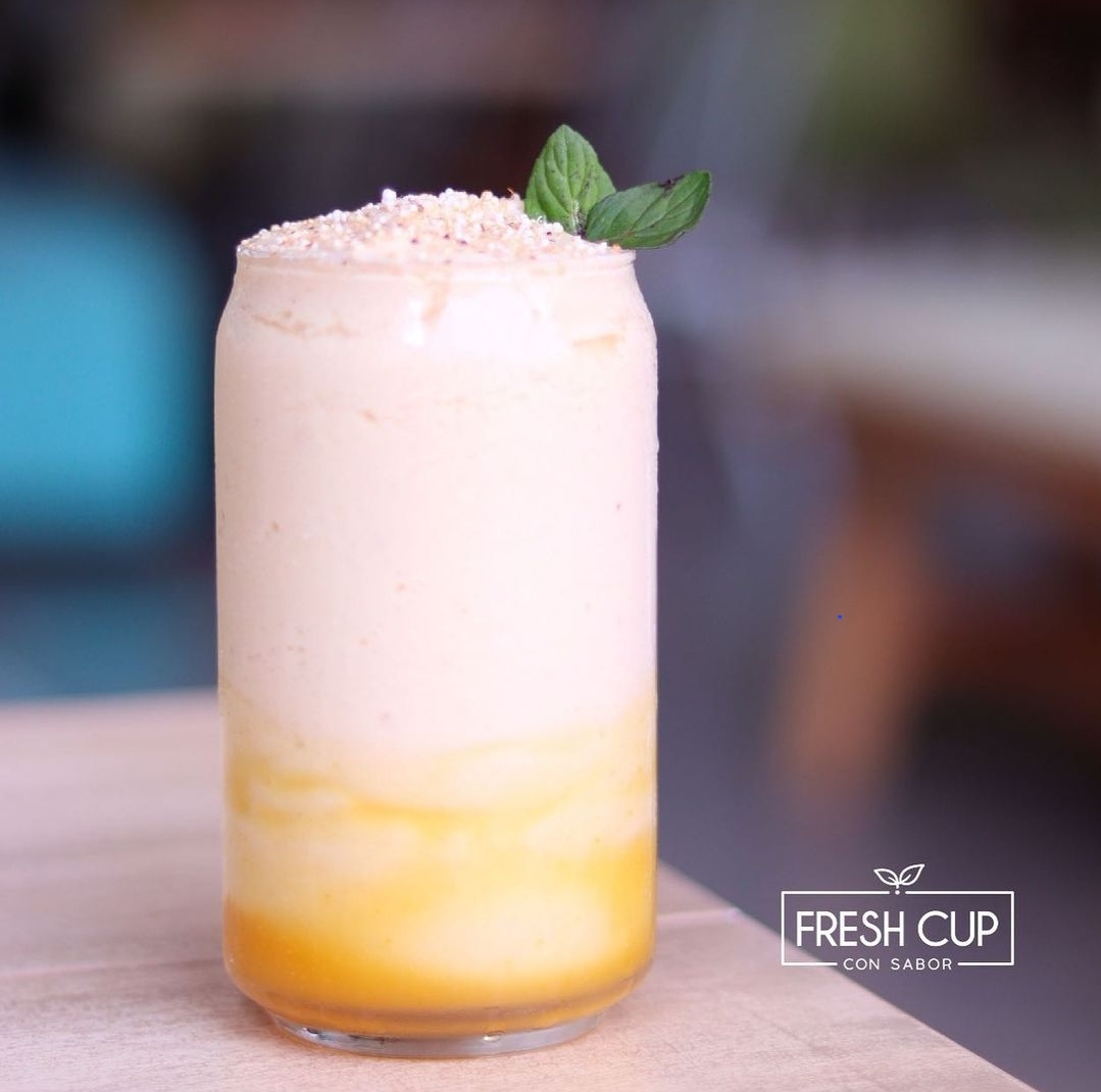 Base de plátano, cacao, mantequilla de cacahuate y leche; topping: mantequilla de almendras, plátano y granola.