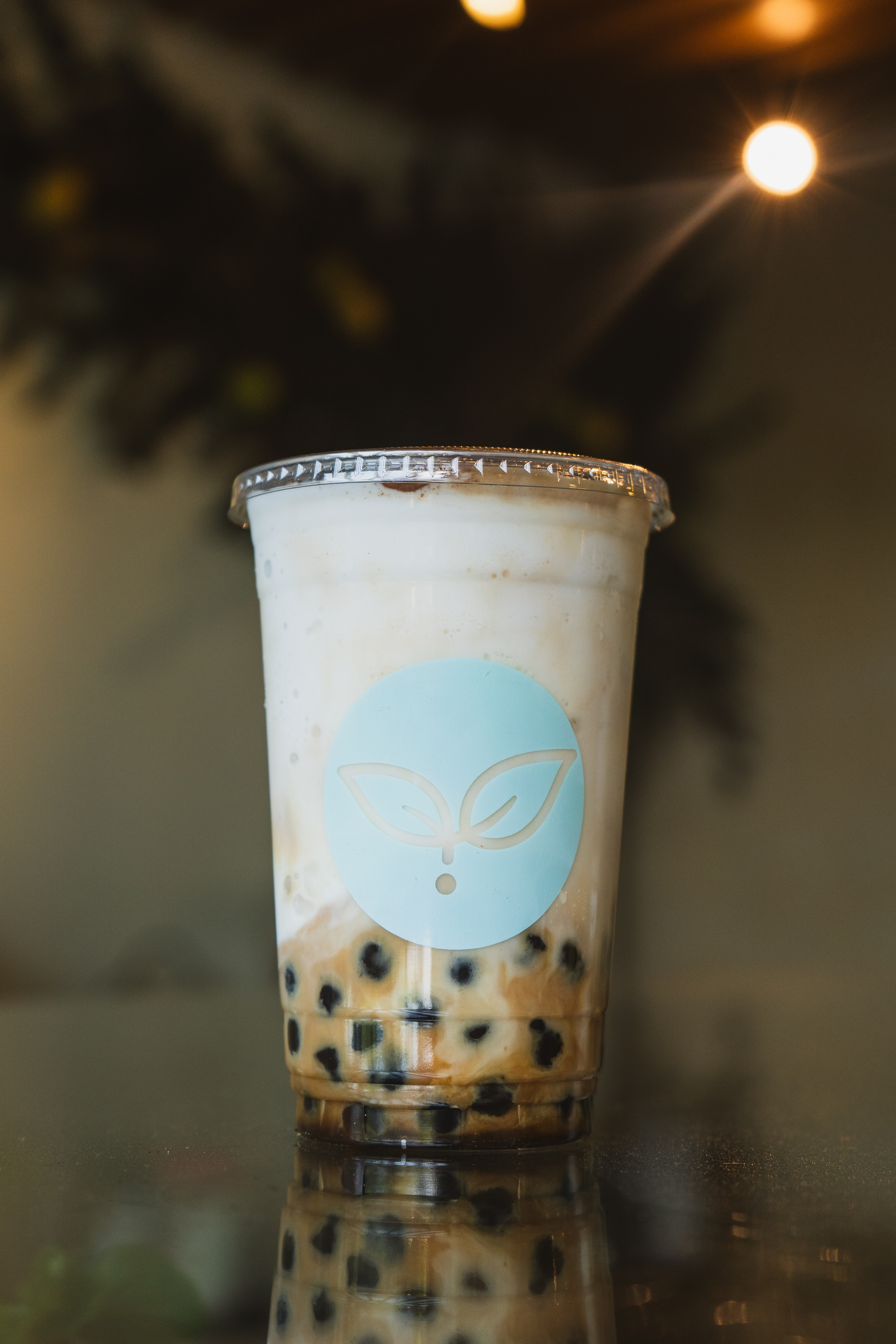 Cacao, plátano, miel de agave, mantequilla de cacahuate y leche.