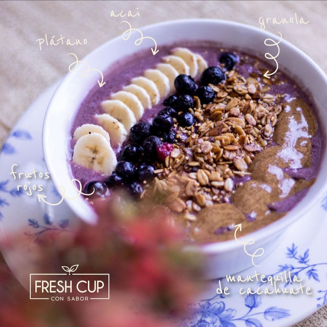 Acai, frutos rojos y plátano; topping: moras, fresas, coco y chía.