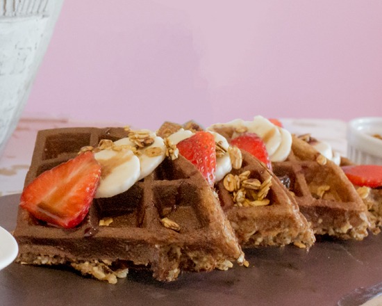 Waffle acompañado de plátano y cocoa.