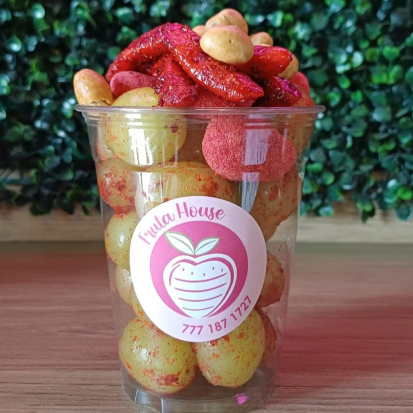 VASO ESPECIAL DE UVAS ENCHILADAS CON UN TOQUE DE LIMÓN Y TOPPINGS PICOSITOS