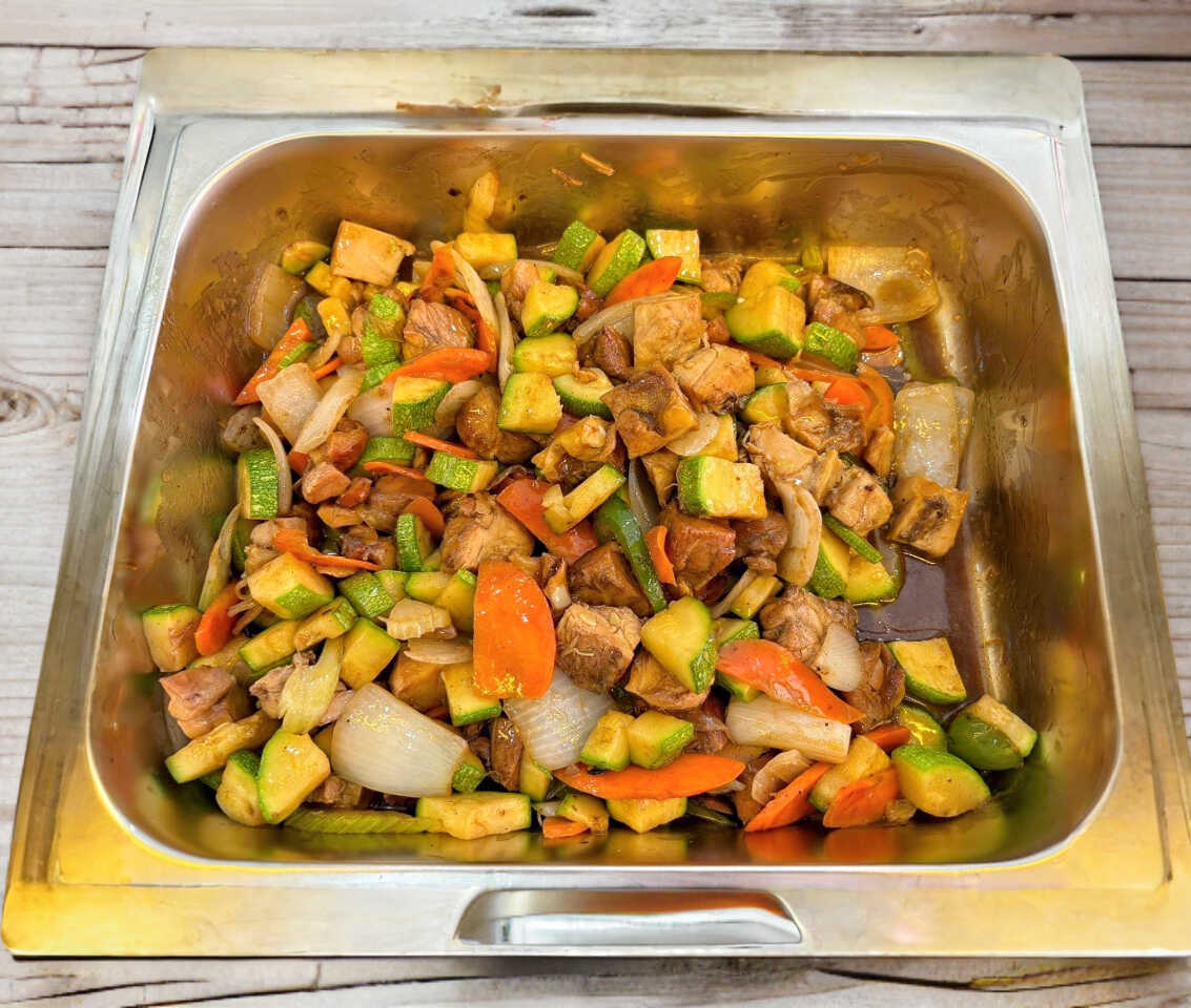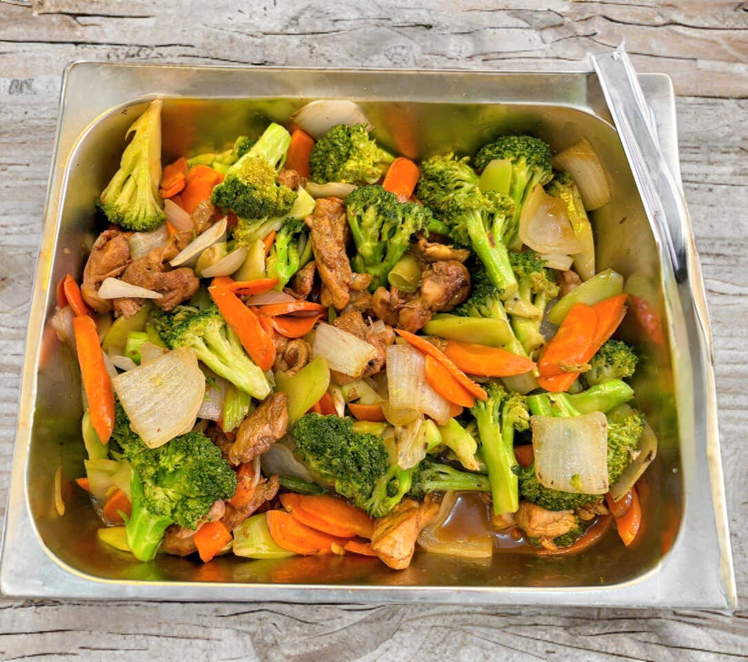 Trozos de pollo bañados en salsa de soya, acompañados de calabaza, zanahoria y apio.