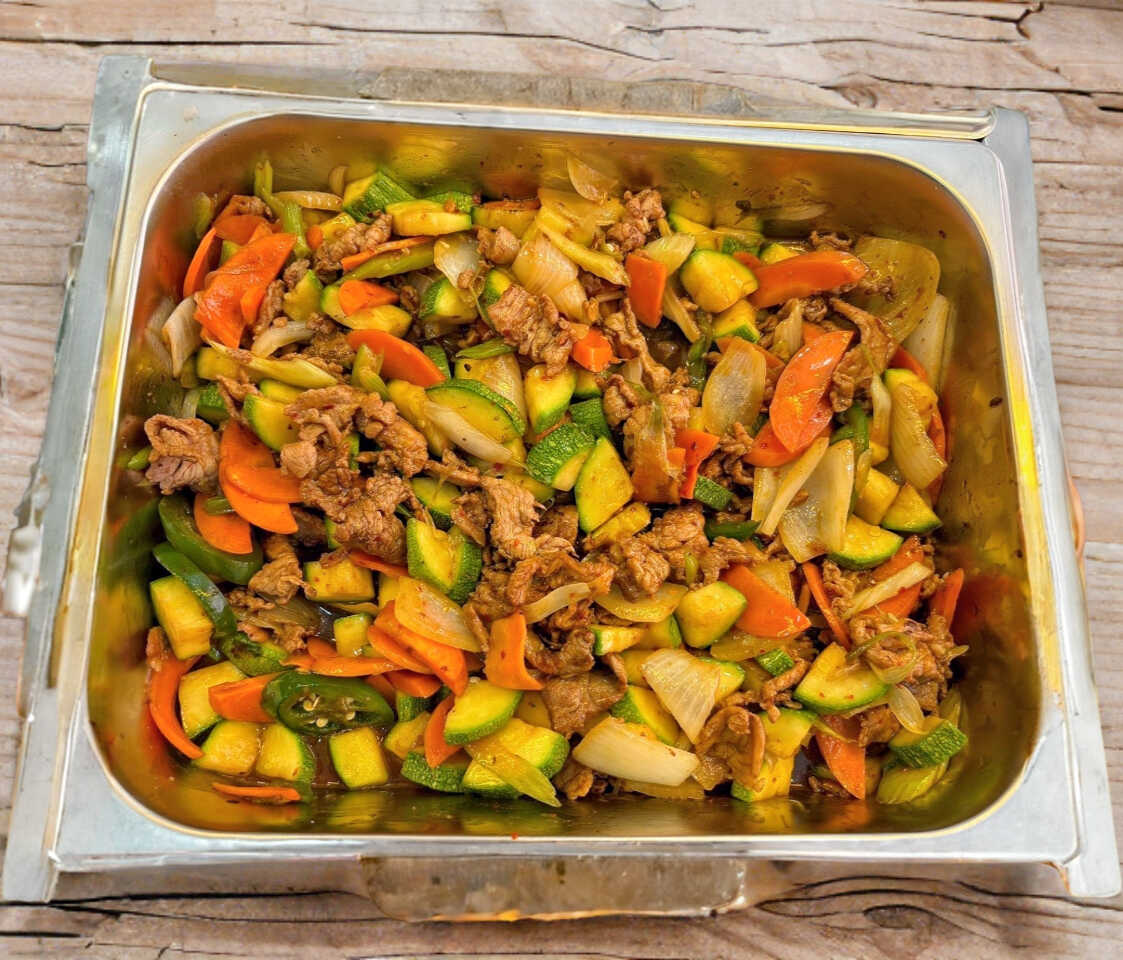 Bistec de puerco en salsa de chile de arbol, acompañado con calabaza, zanahoria y apio.