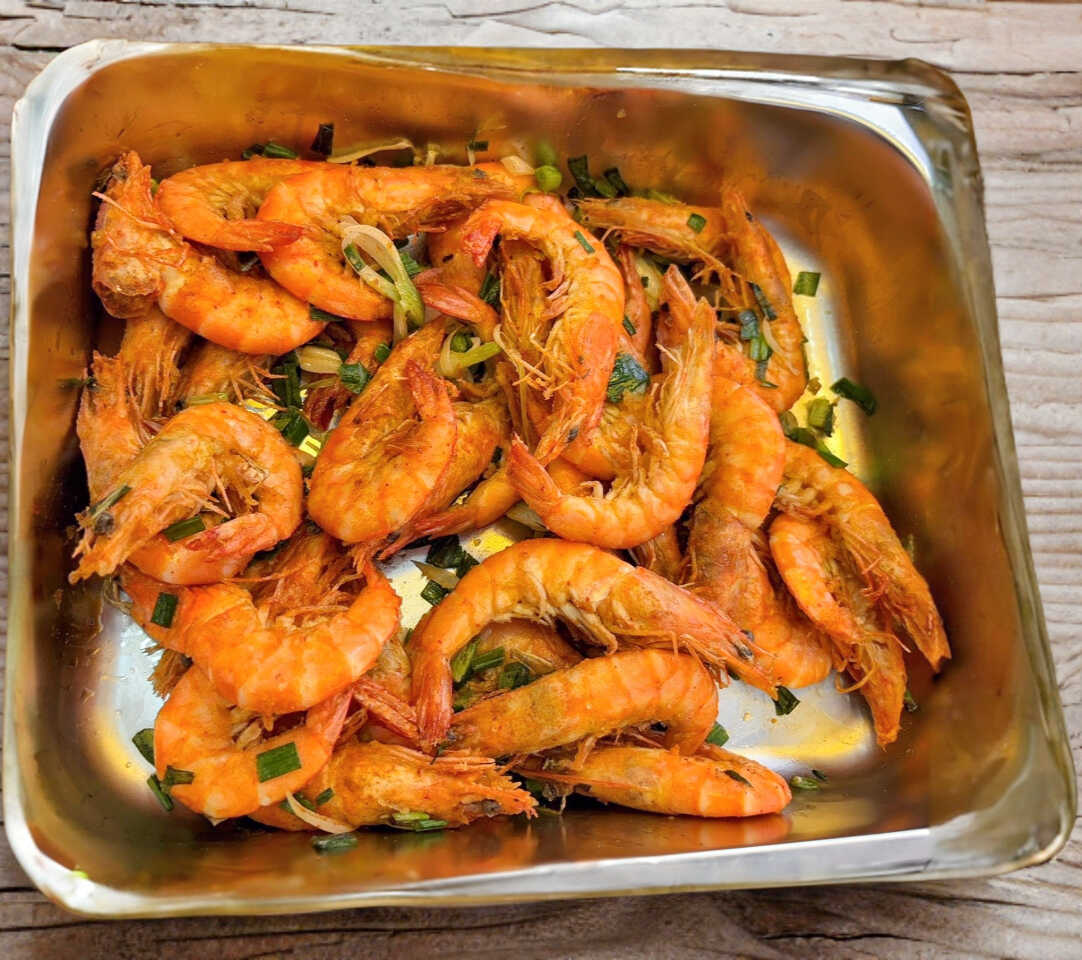 Piezas enteras de camarones fritos con condimentos chinos, acompañados con cebollin.