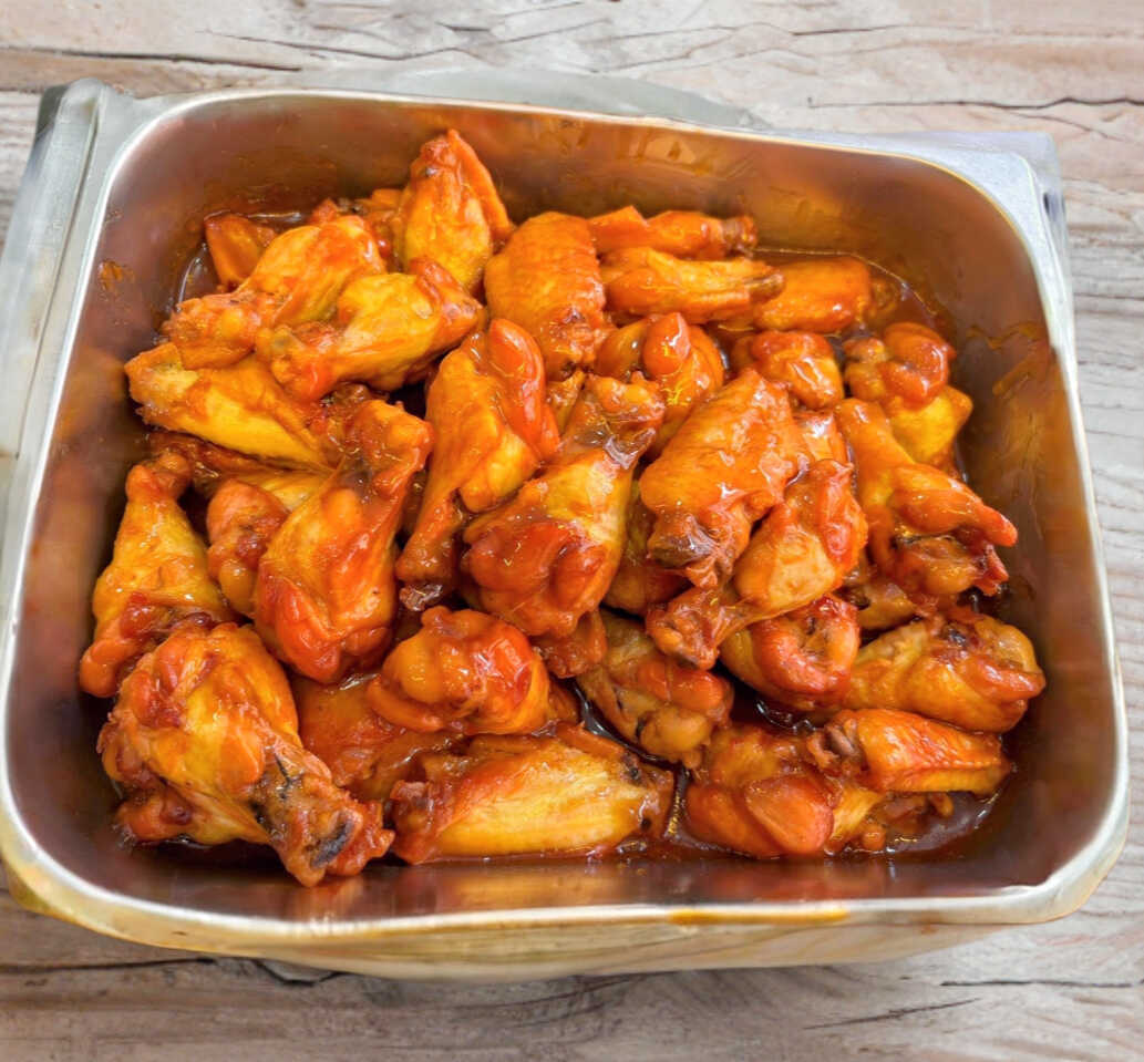 Alitas de pollo bañadas en salsa agridulce.