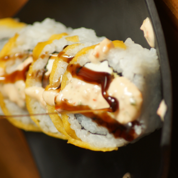 Dentro: Aguacate, zanahoria tempura y queso crema. Fuera: Platano macho, tampico y salsa de anguila.