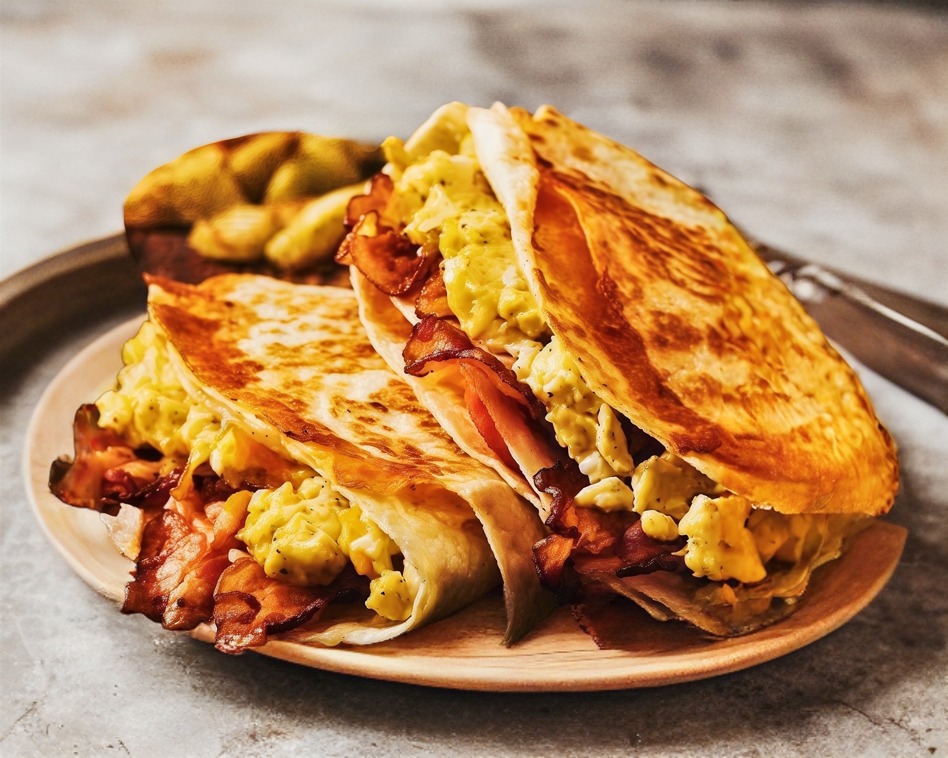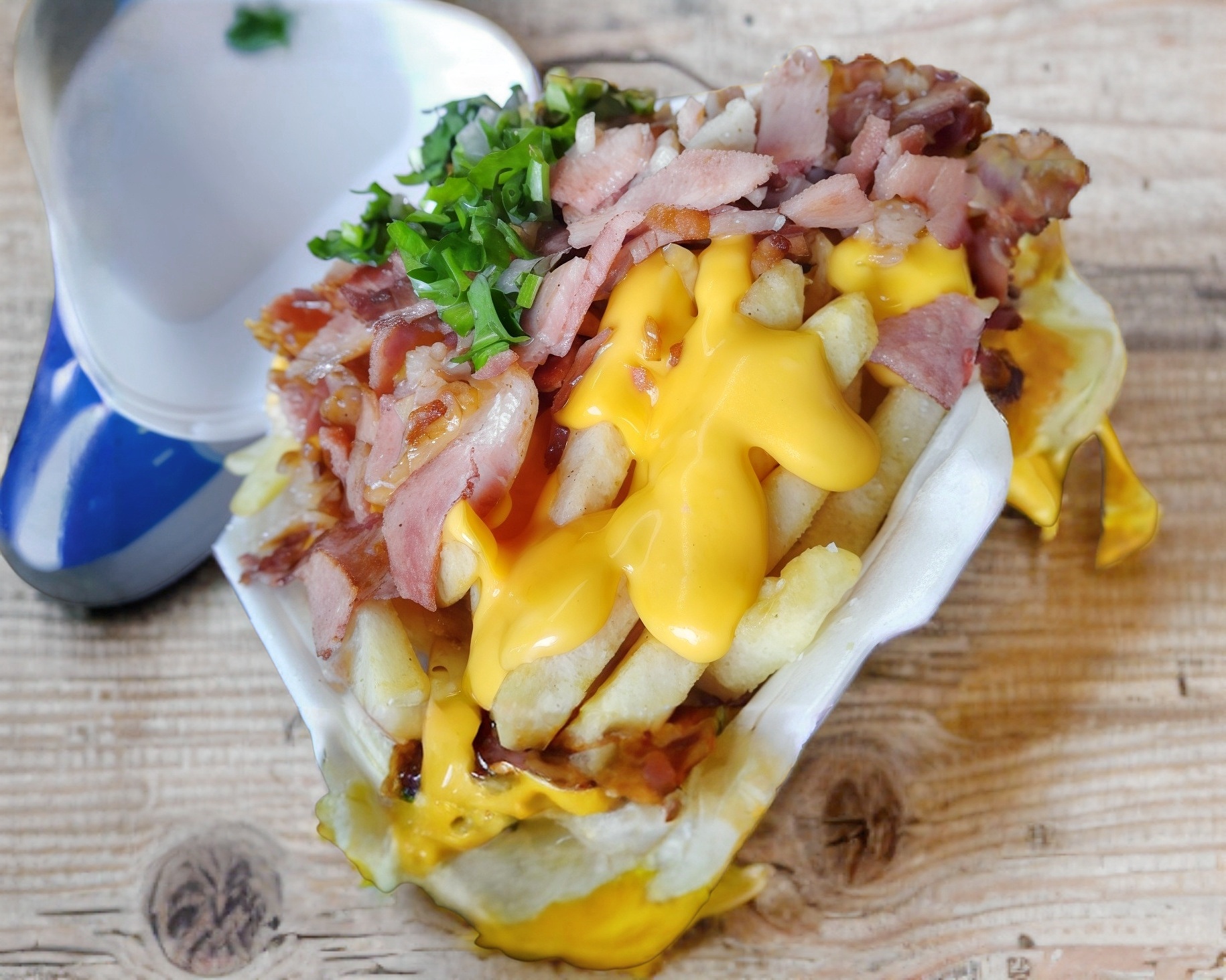 Tocineta y queso gratinado. Acompañada de una pequeña porción de papas.