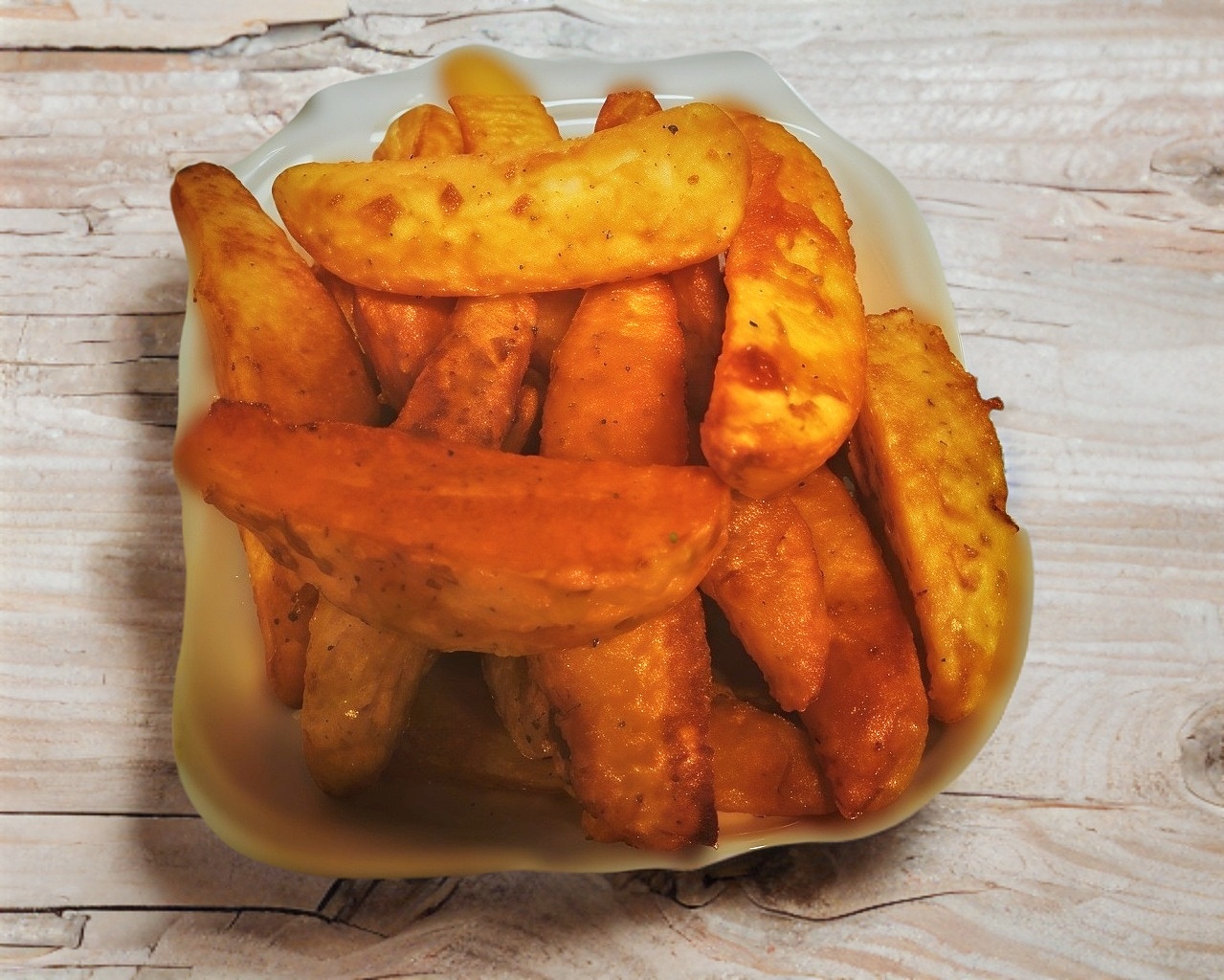 Papas a la francesa (150-200 g aprox.): ¡crujientes y acompañadas de queso cheddar derretido para untar! Porción personal.