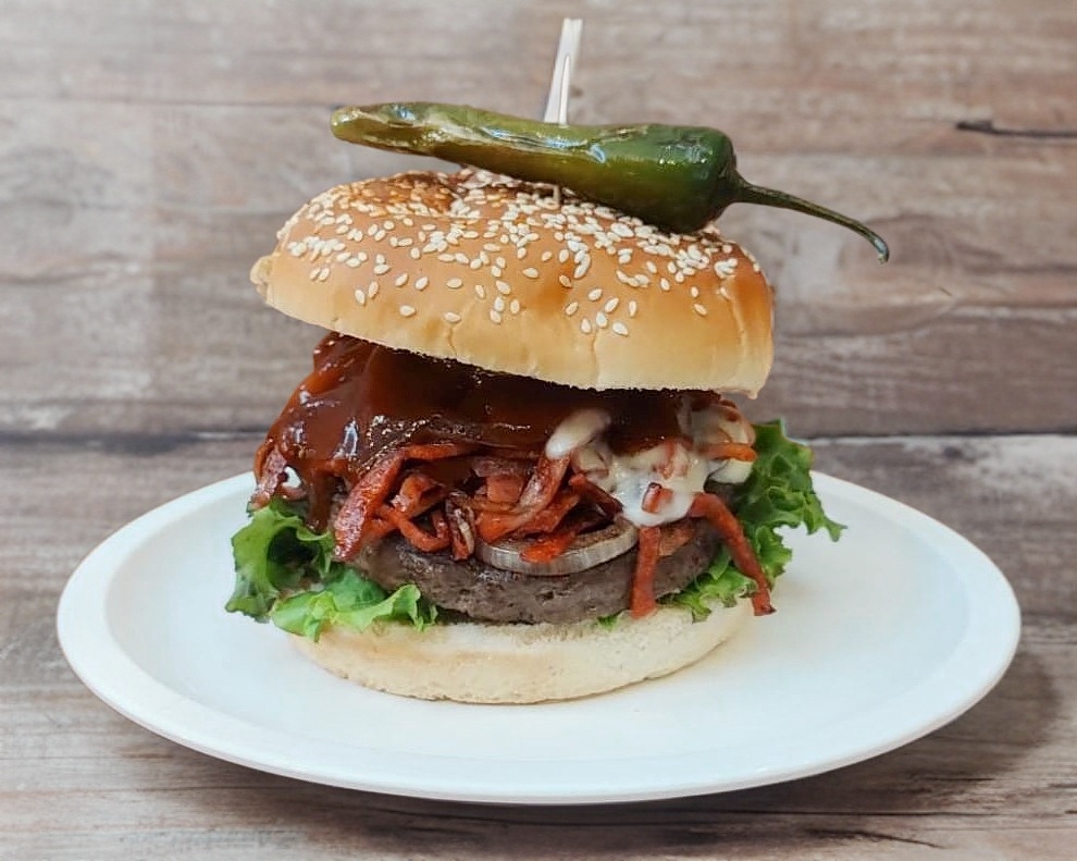 Pan de ajonjolí con carne sirloin, tocino, champiñones, cebolla y queso gratinado.