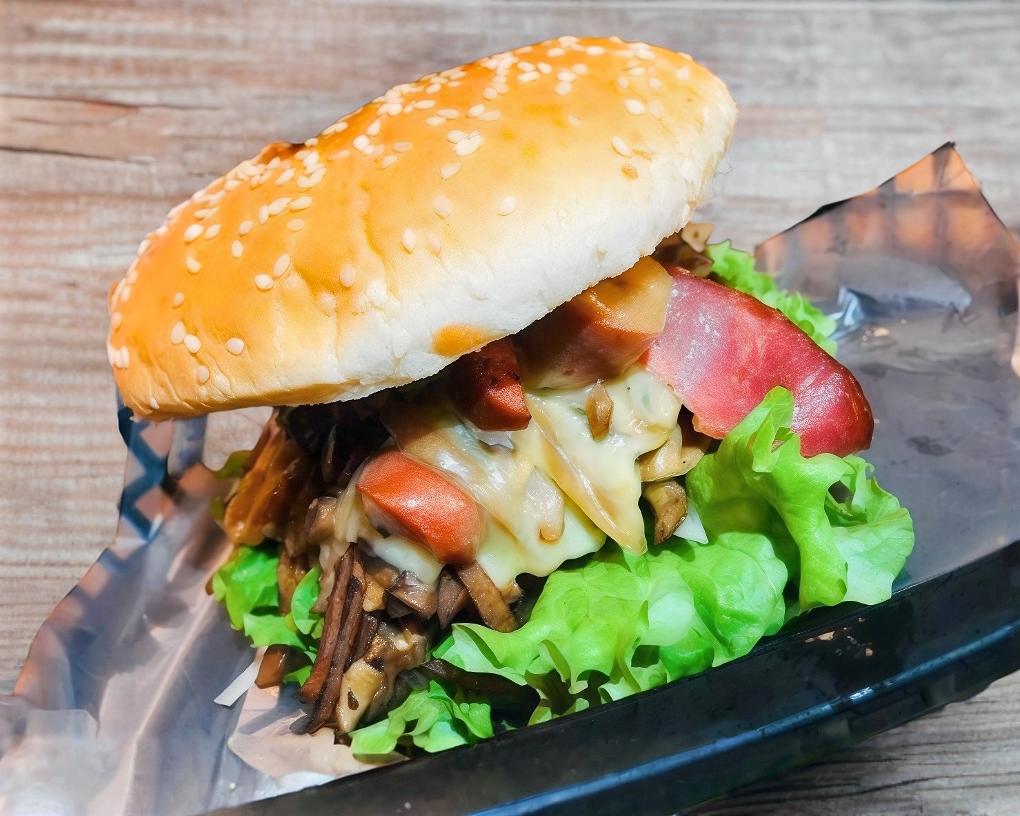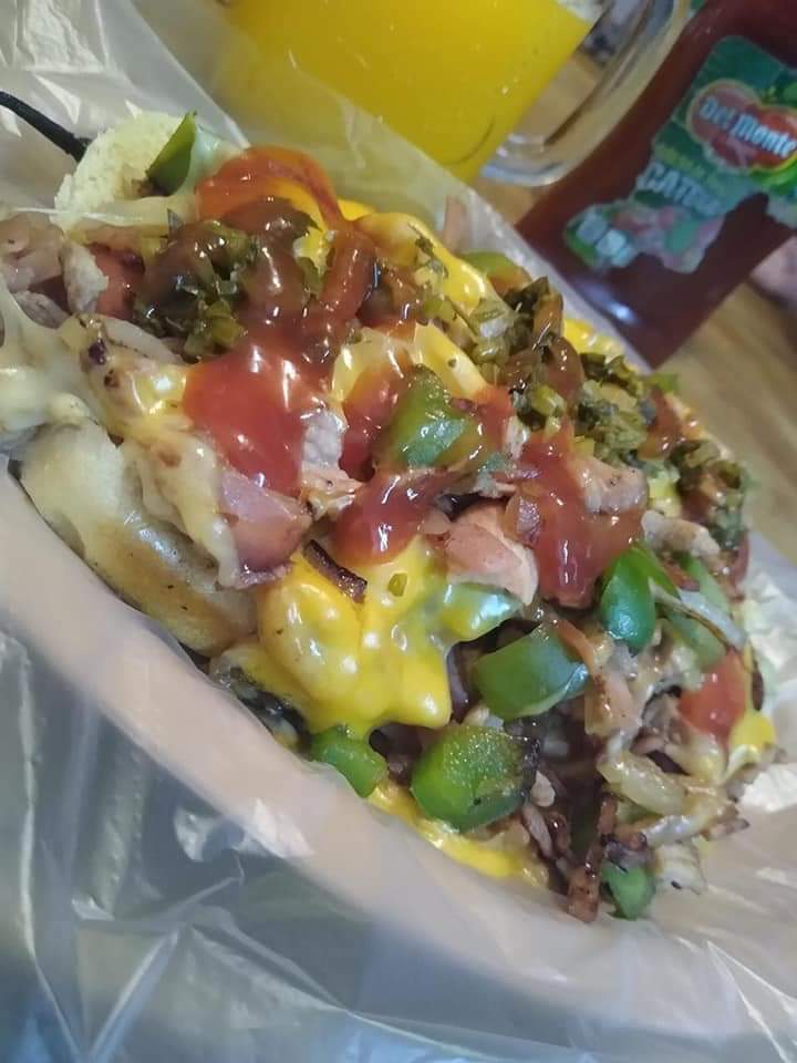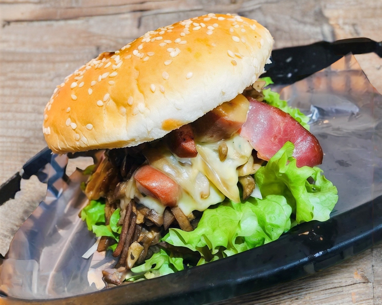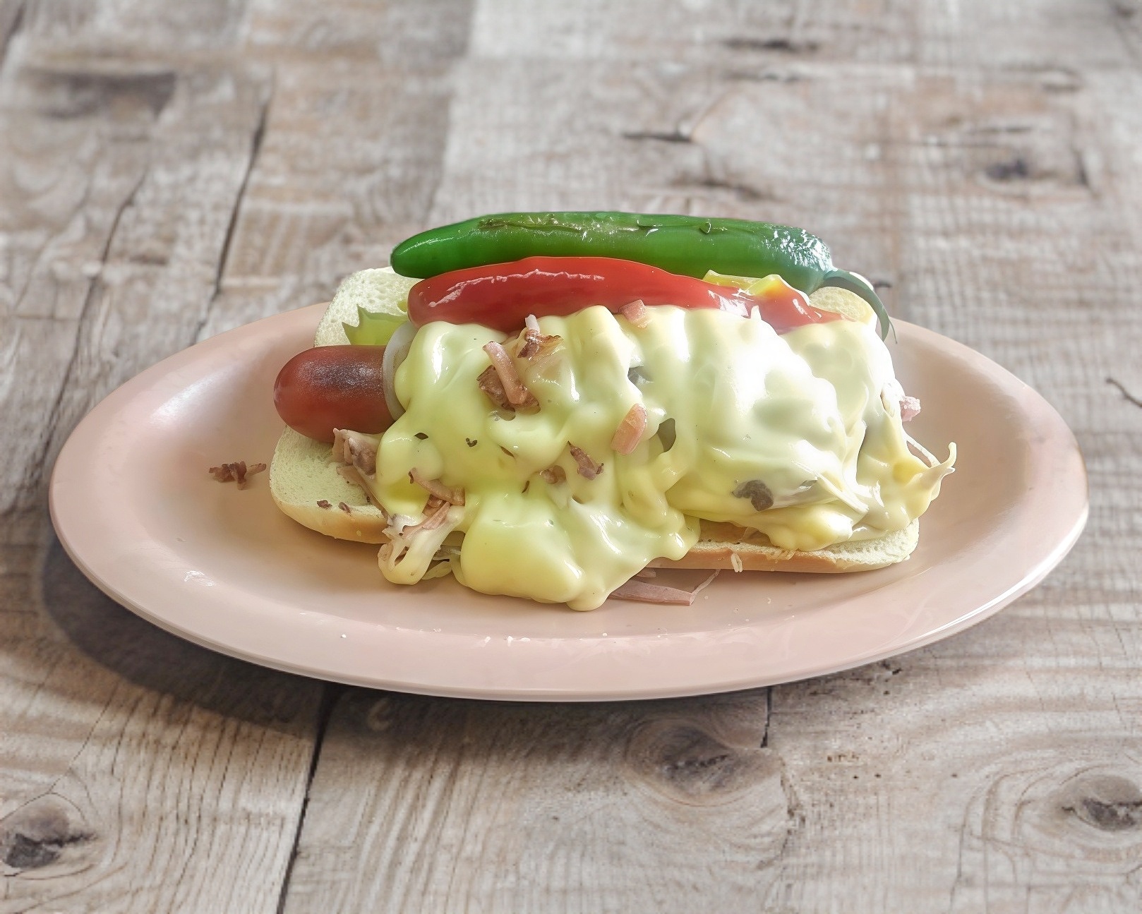Salchicha de res, tocino, champiñón, cebolla y queso gratinado.