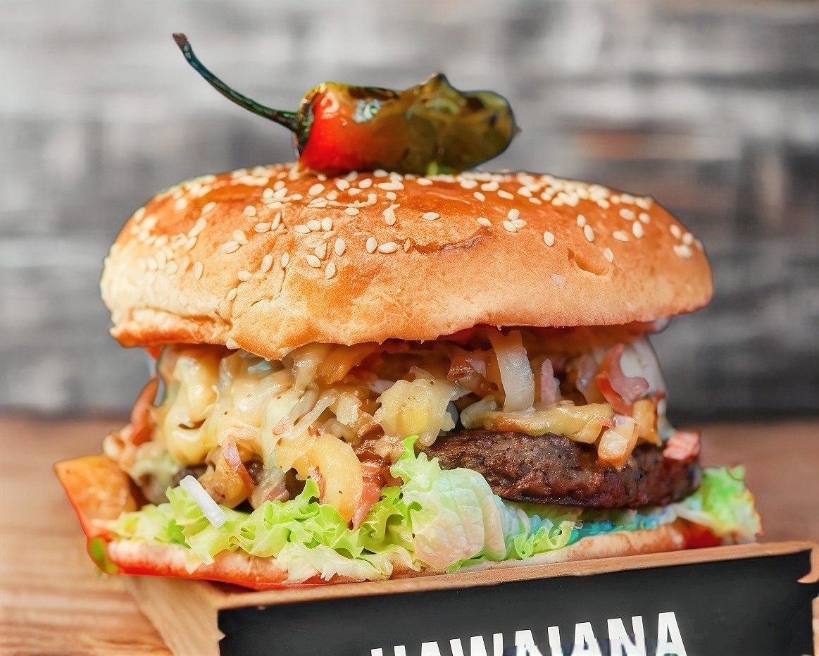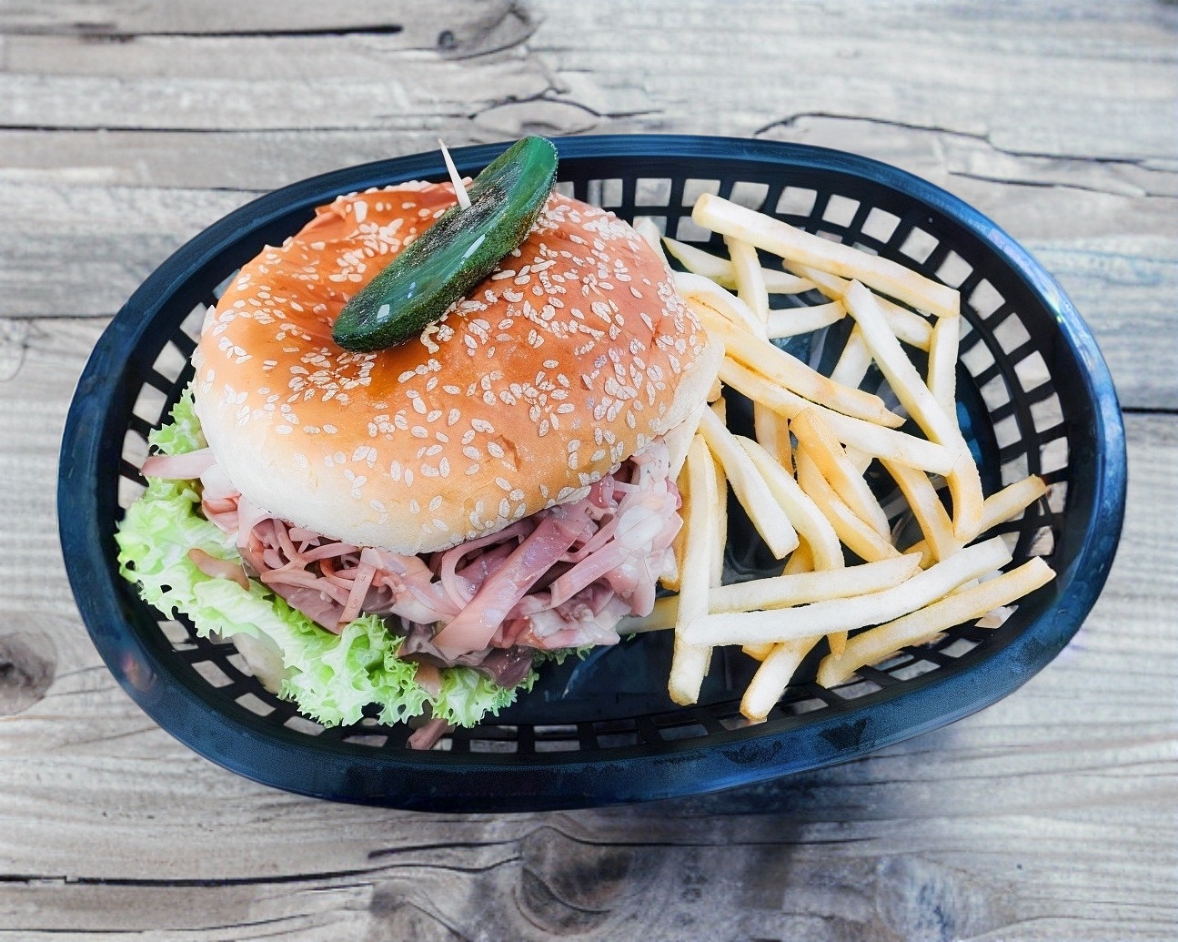 Pan ajonjolí con carne sirloin (100 g), tocino, piña, jamón y queso gratinado.