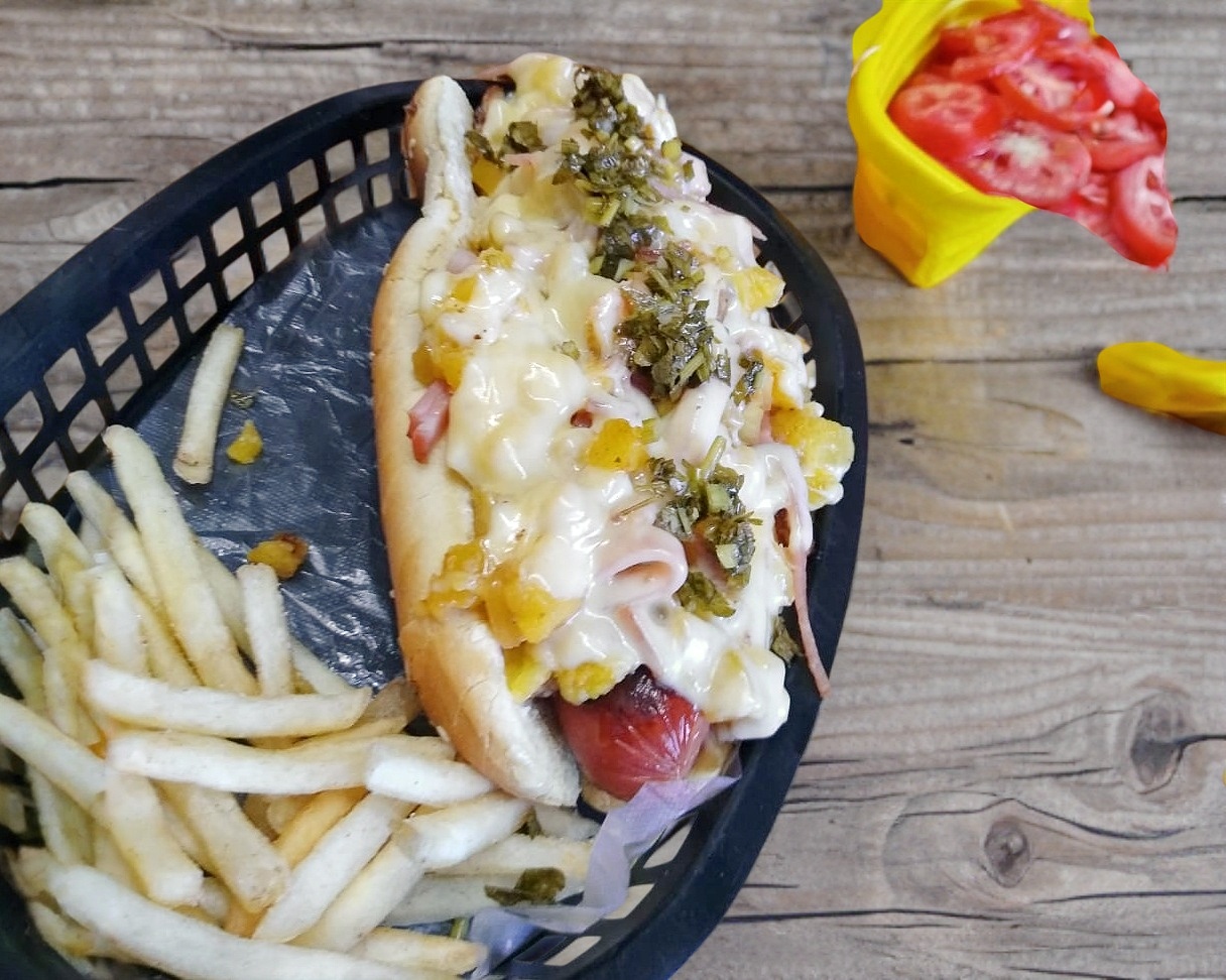 Salchicha de res, tocino, piña, cebolla, queso gratinado.