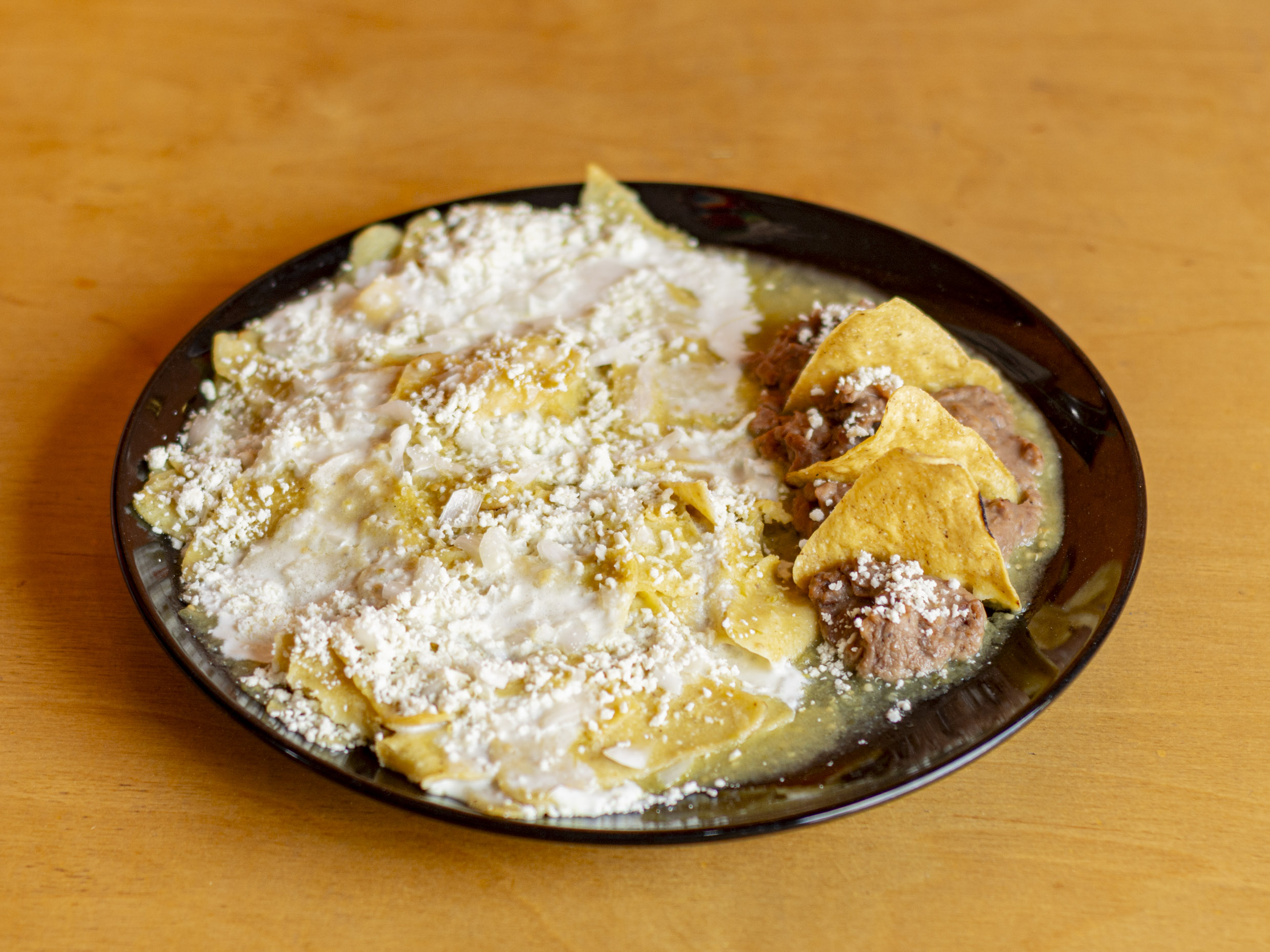 Deliciosos chilaquiles verdes en salsa de tomate y chile, con crema, queso y cebolla. Acompañados de frijoles refritos y totopos.