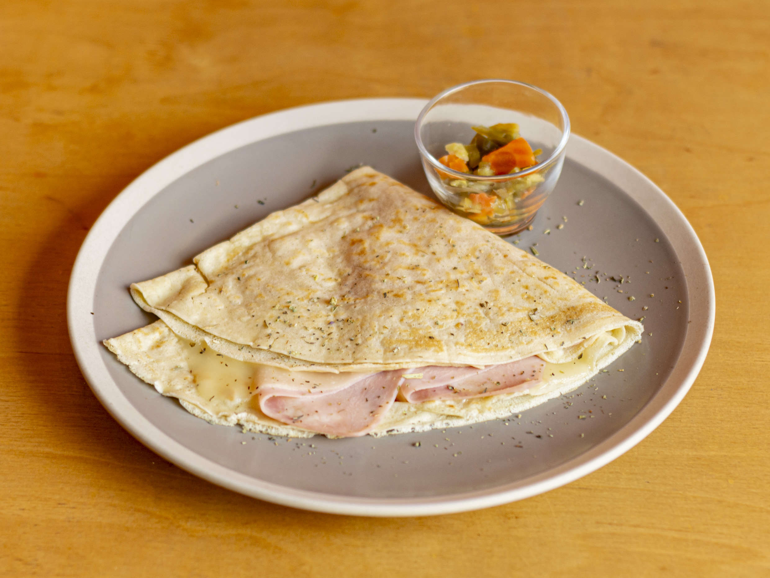 Deliciosas sincronizadas con tortilla de harina, rellenas de jamón de pavo con queso oaxaca, acompañadas de pico de gallo o chiles en vinagre. (2 pz partidas por la mitad)