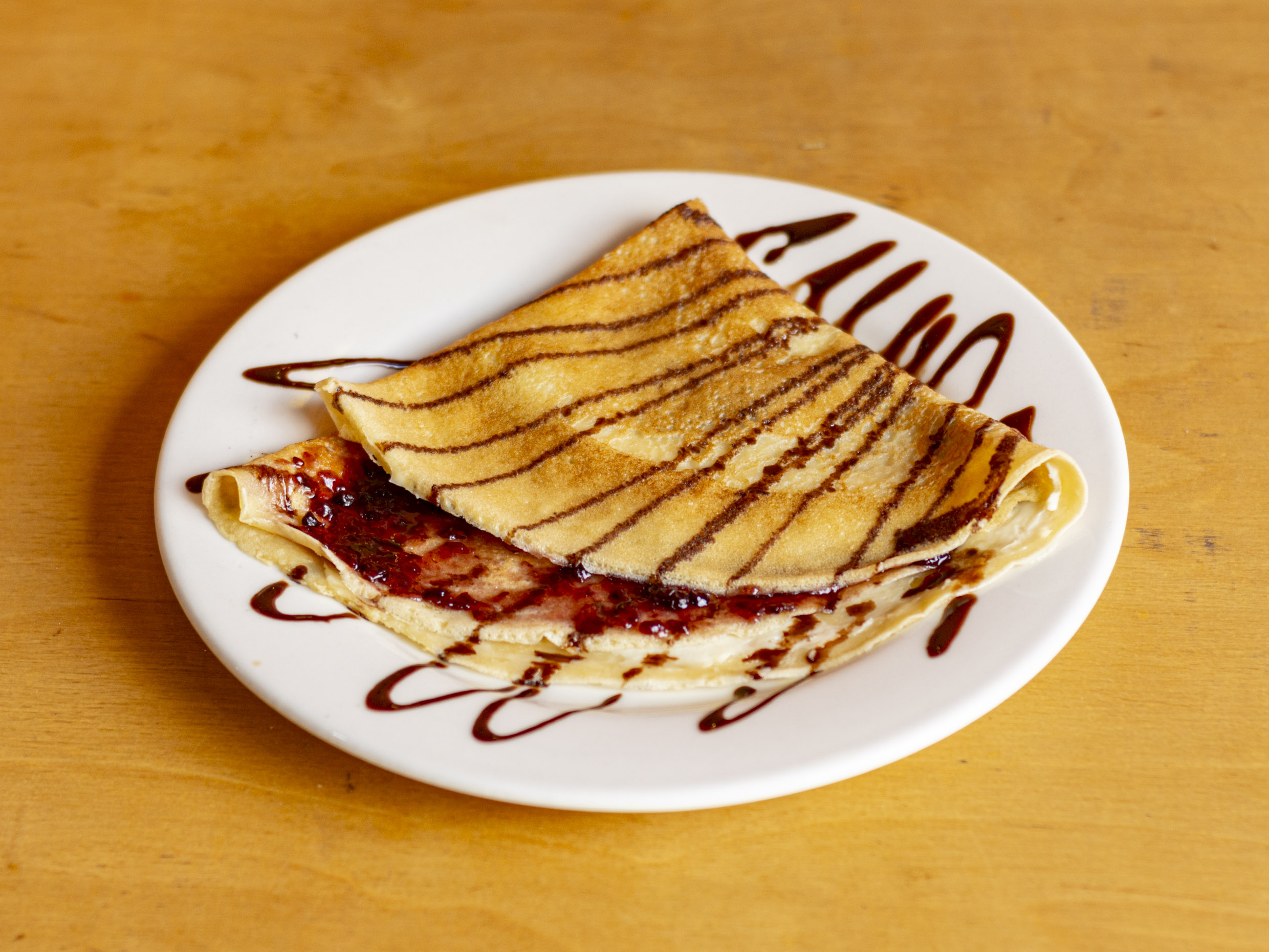 Crepa de Durazno con chocolate, decorada con jarabe de chocolate