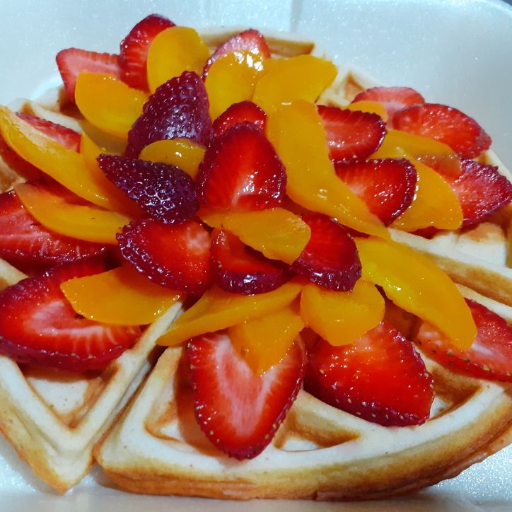 Delicioso waffle receta de la casa con ingredientes de tu preferencia y coronado con crema batida. (1pz dividido en 4).