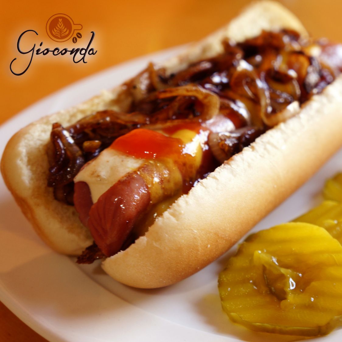 Envuelto en tocino, acompañado de cebolla caramelizada, mayonesa, mostaza, salsa catsup y pepinillos.