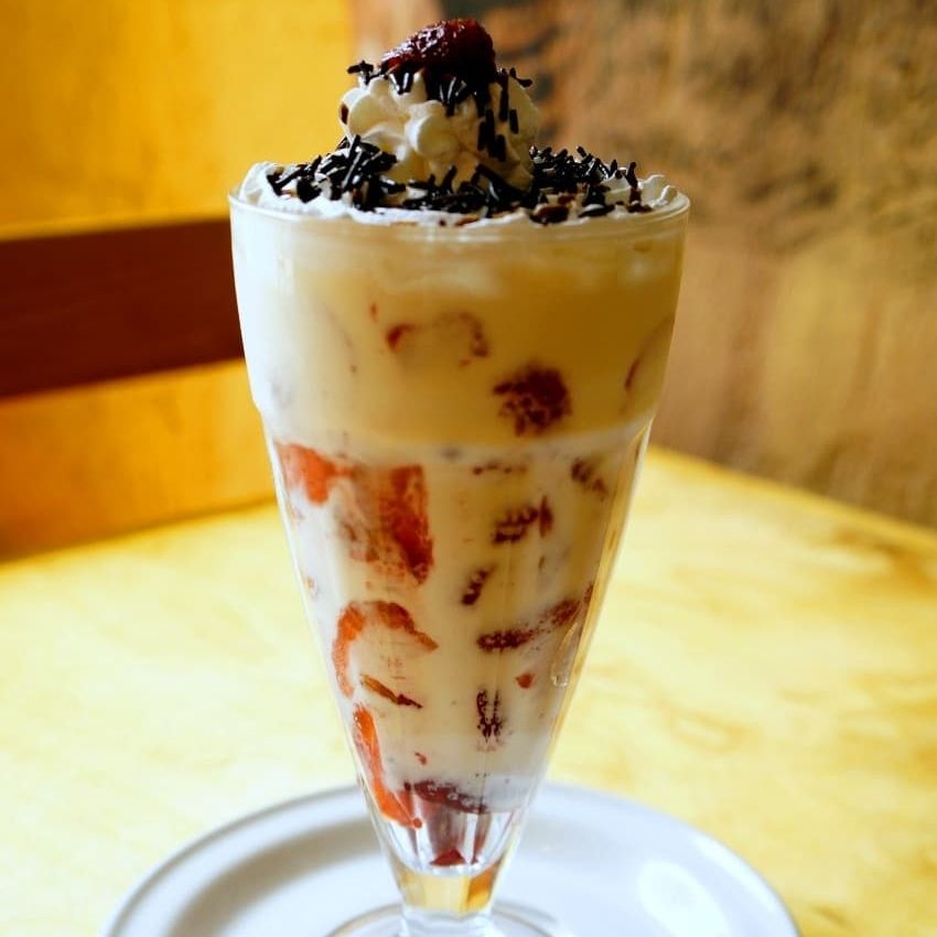 Popular postre francés acompañado con los ingredientes dulces de tu elección. Decorada con jarabe de chocolate.
