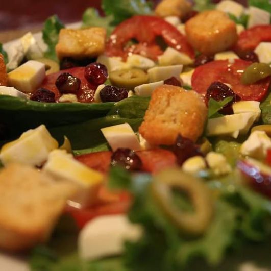 Exquisita ensalada a base de lechuga con jitomate, pepino, aceitunas, queso panela, arándanos, croutones y aderezo de miel con mostaza.