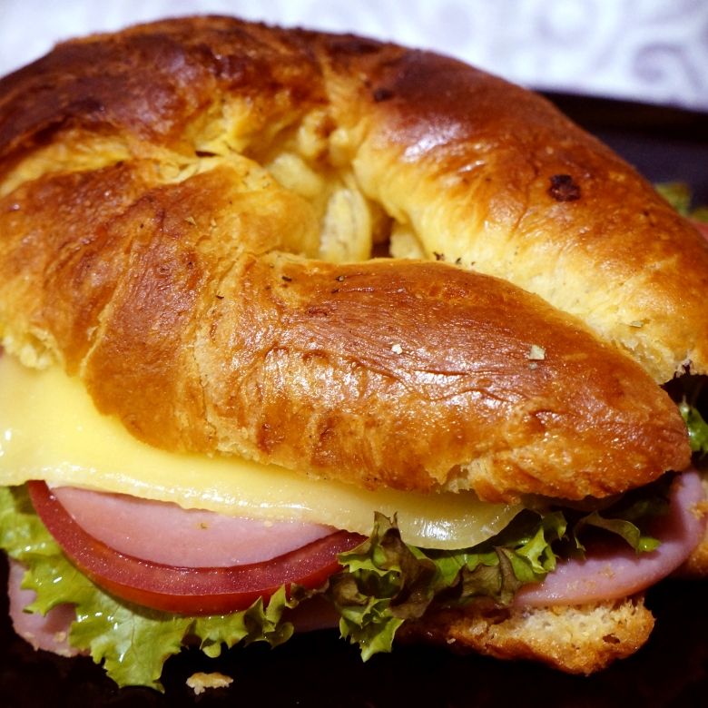 Croissant relleno de jamón de pavo, queso manchego gratinado y aderezo de miel con mostaza, con un toque de mantequilla y hierbas finas, acompañado de lechuga y jitomate.
