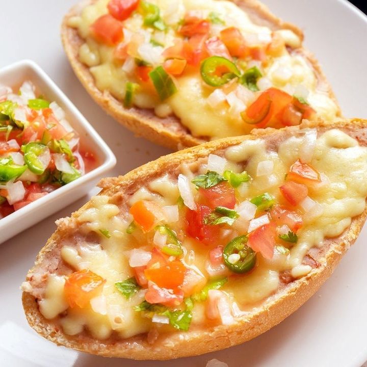 Deliciosos molletes con frijoles refritos, gratinados con queso manchego y acompañados de pico de gallo
