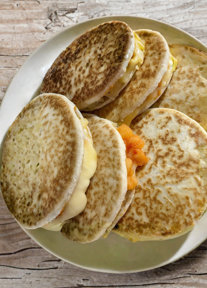 Gordita de harina de trigo rellena de carne de res con adobo rojo y queso gouda