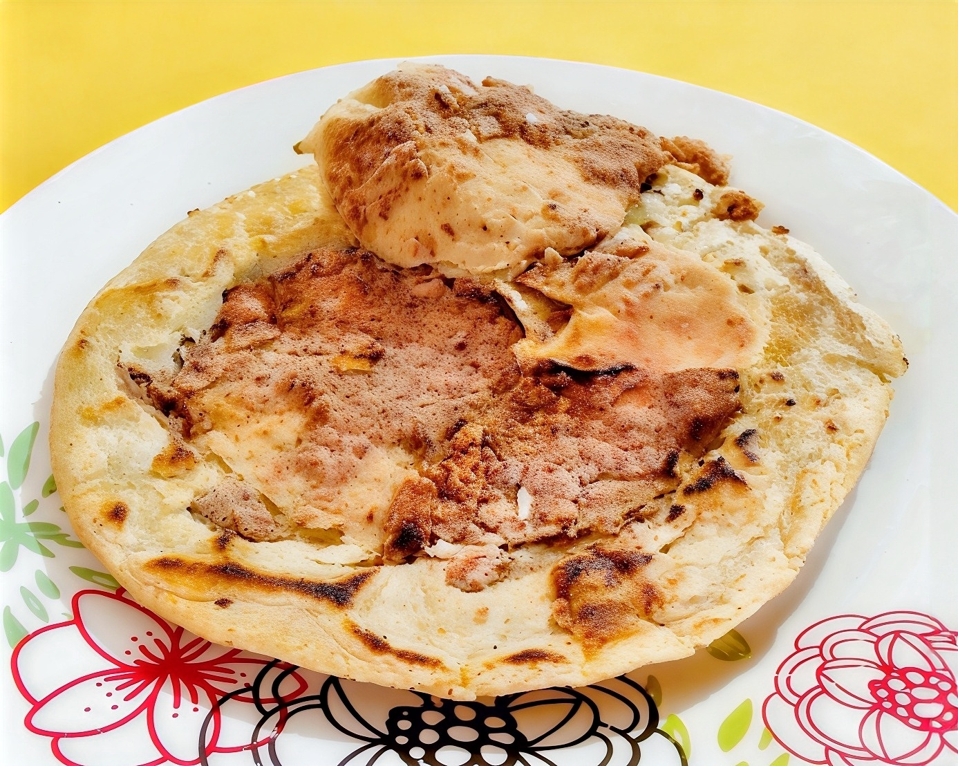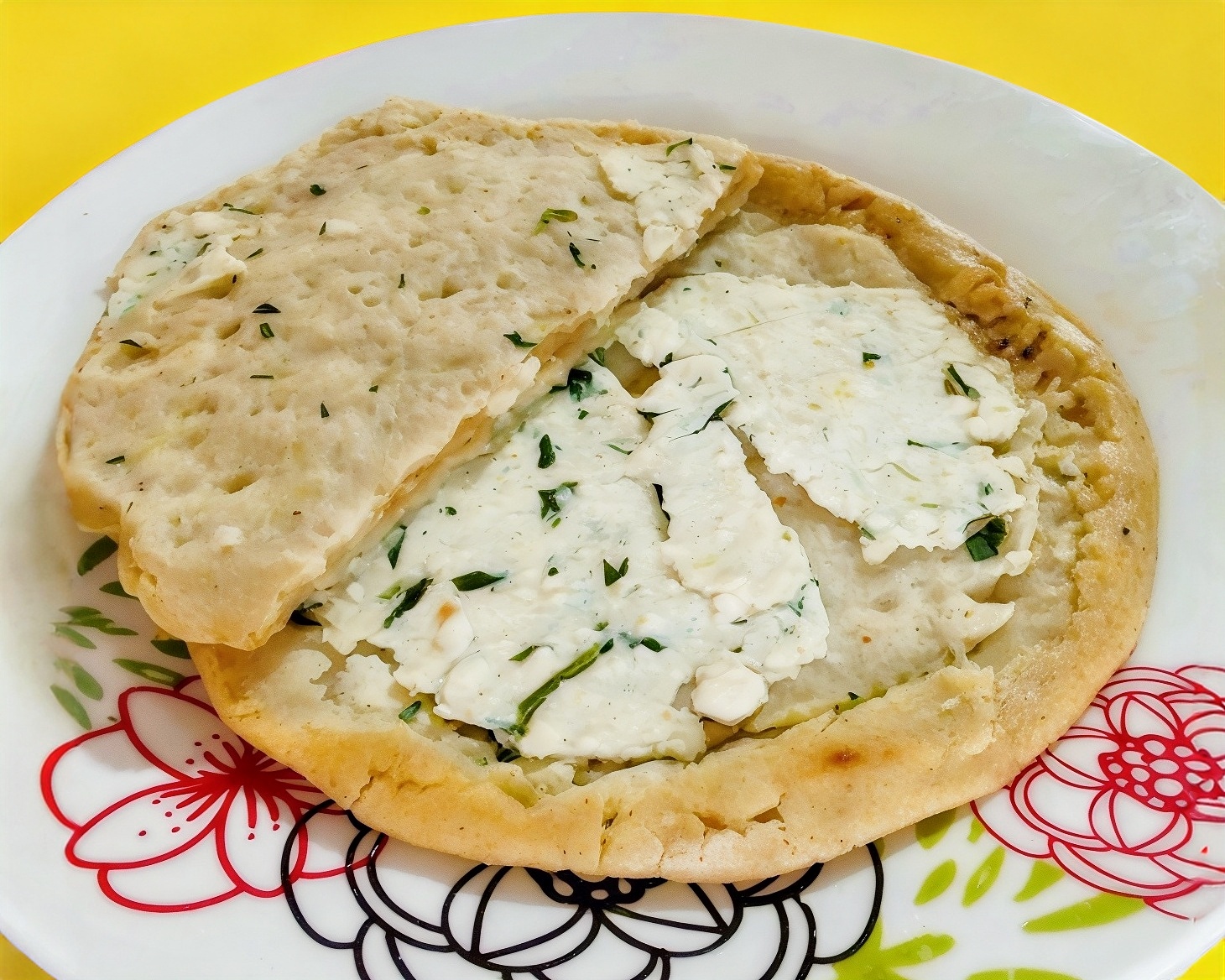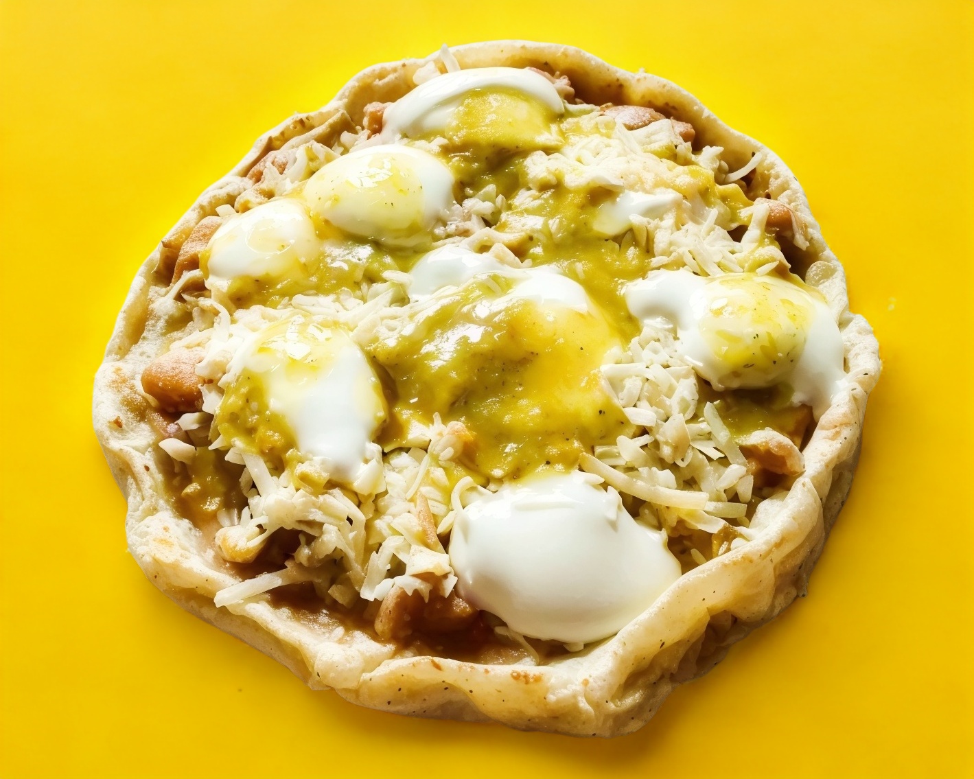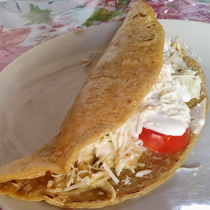 Gorda de requesón con crema, salsa y queso.