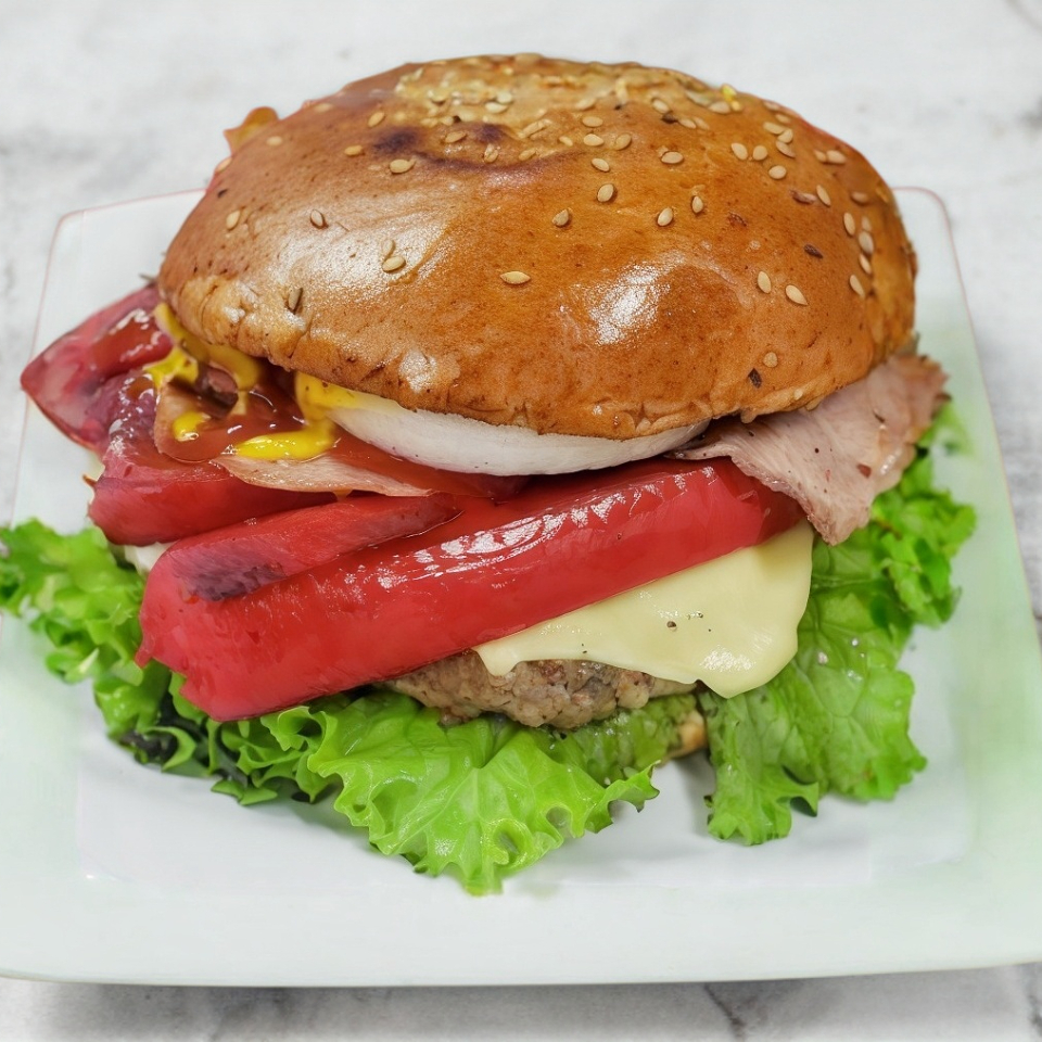 Carne de res jamón queso amarillo queso Oaxaca verduras salsa BBQ