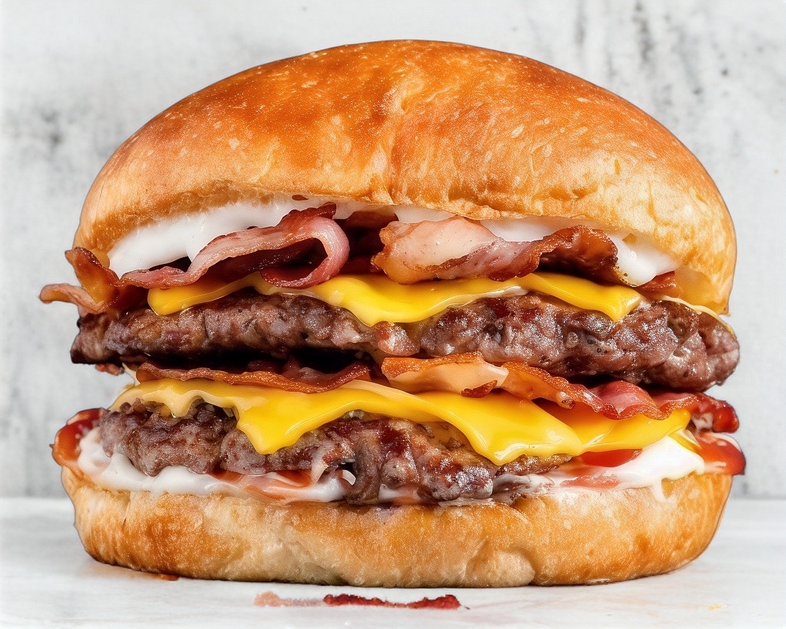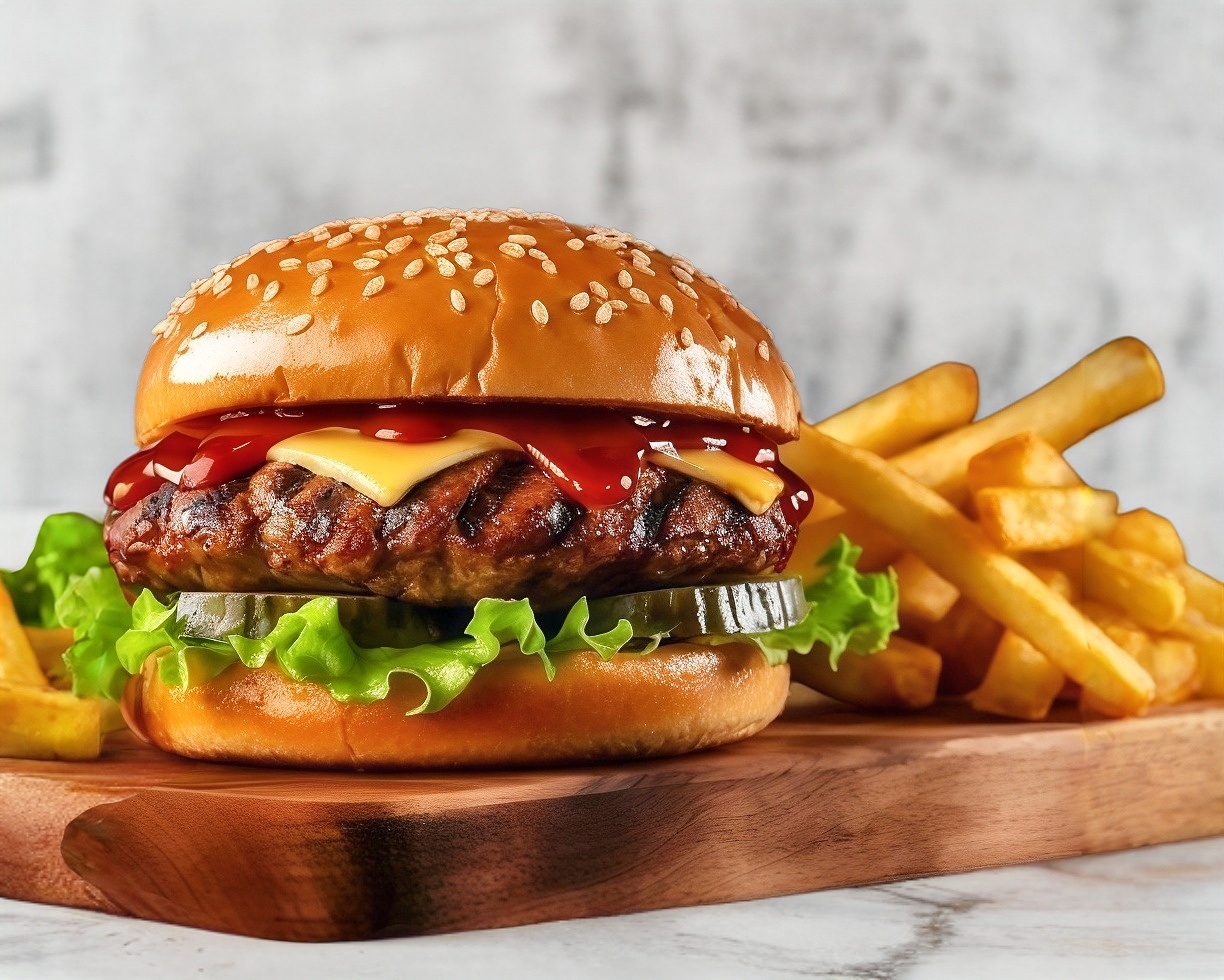 Hamburguesa de res con queso, lechuga, tomate, cebolla, pepinillo, cátsup, mostaza y mayonesa.