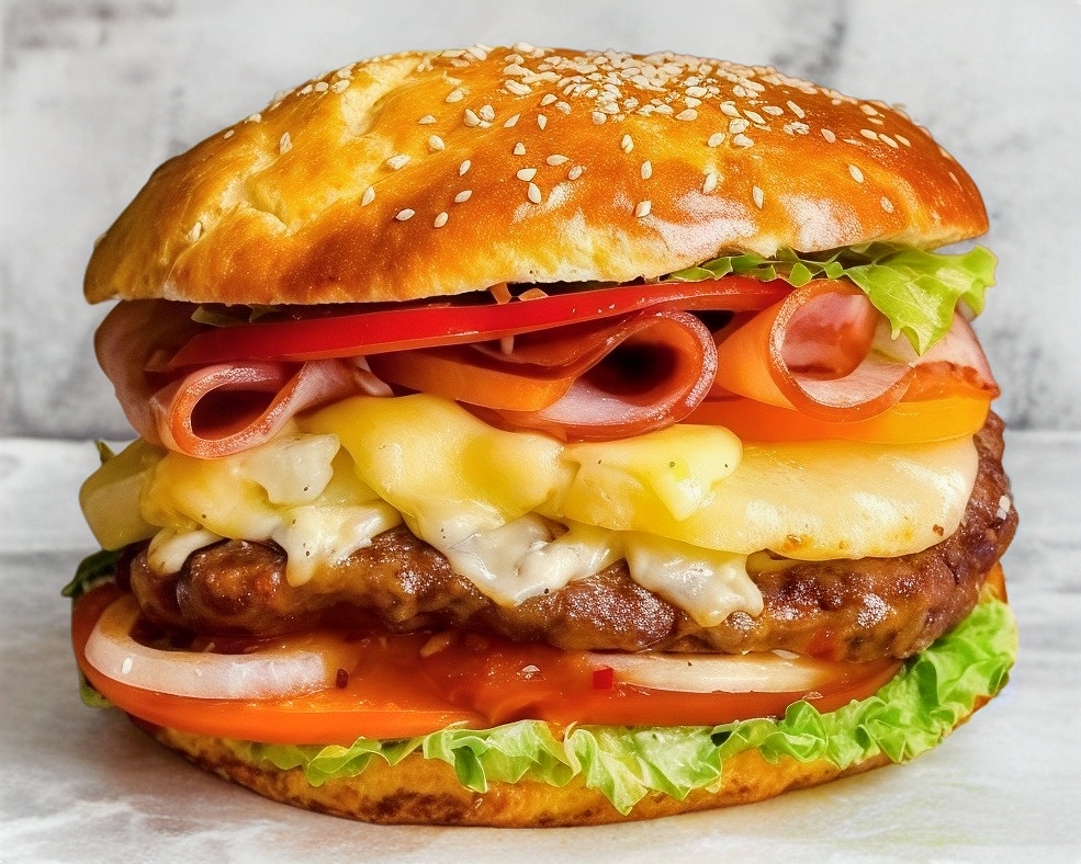 Elaborada con carne de res queso amarillo, jamón, mayonesa, piña, jitomate, cebolla y pepinillos.