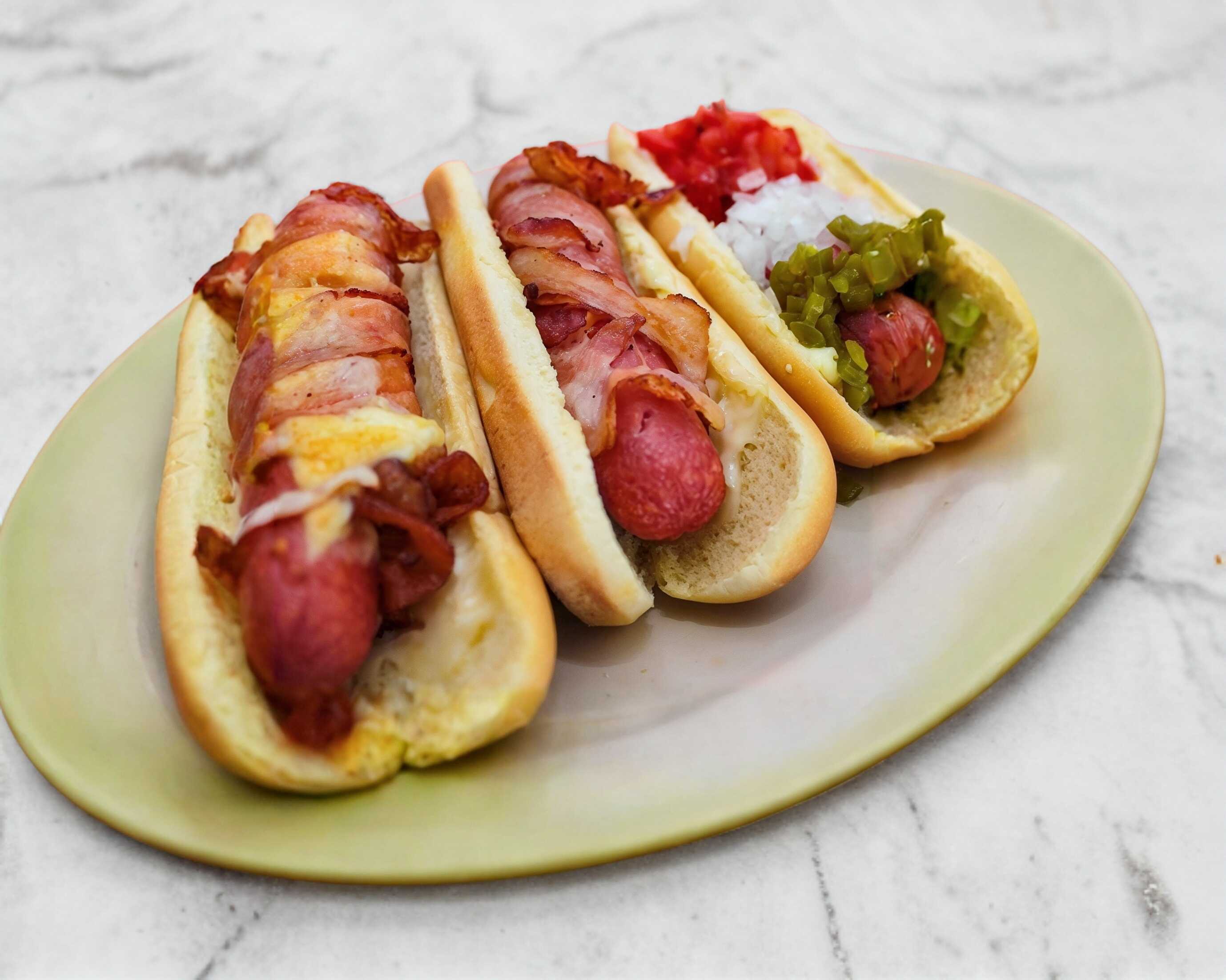 Orden de 3 hot dogs preparados con salchicha frita, tocino, cátsup, cebolla, jitomate y mostaza.