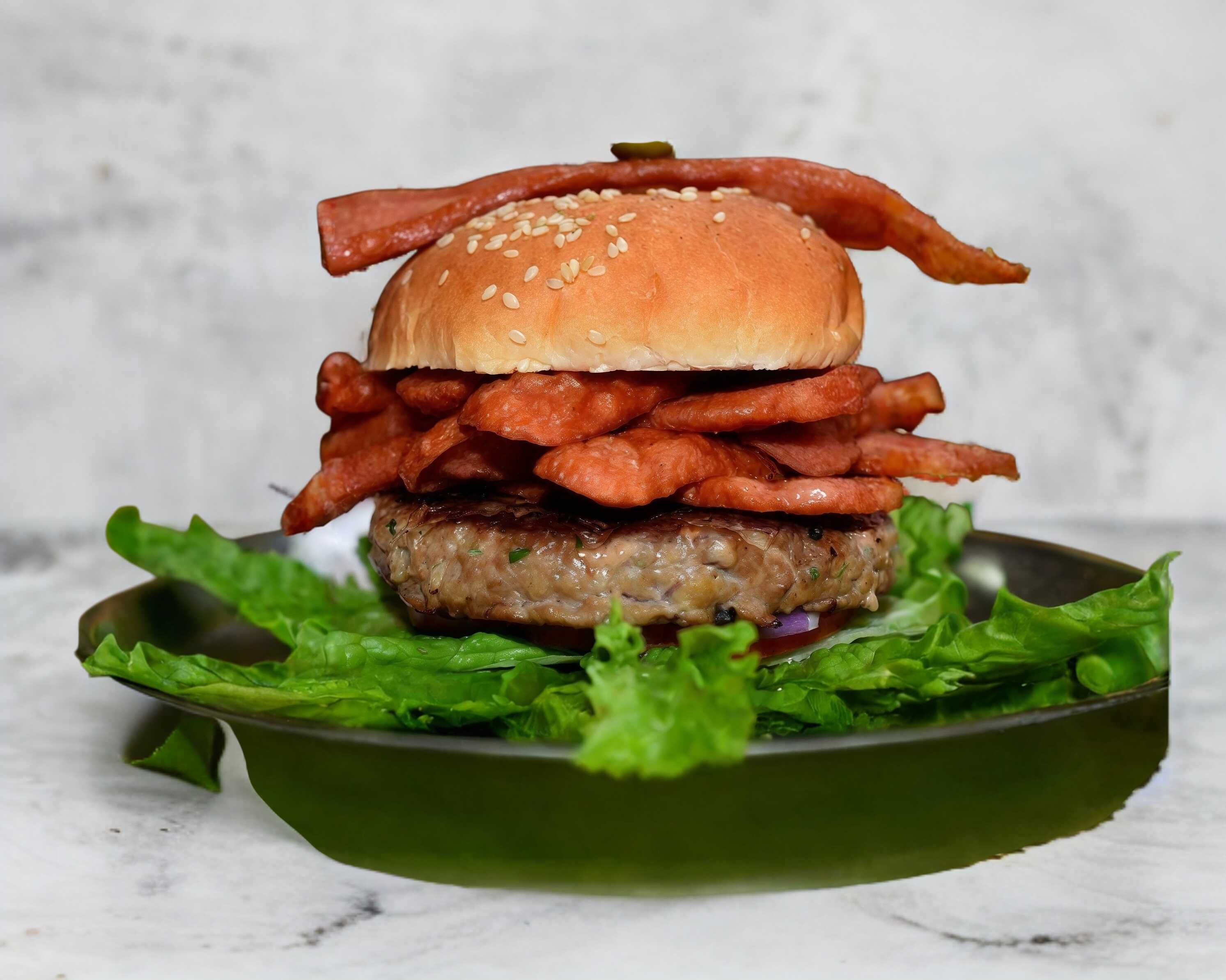 Elaborada con carne de res, tocino mayonesa, cátsup mostaza, lechuga, jitomate, cebolla y pepinillos.
