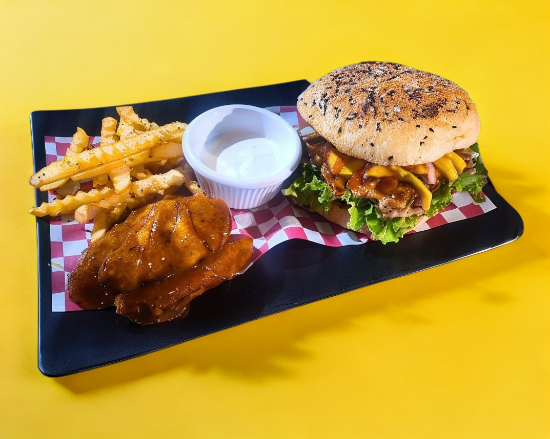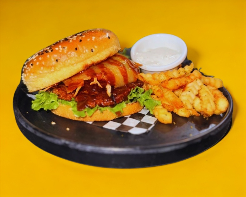 Hamburguesa con salsa BBQ, incluye papas a la francesa 200 g.