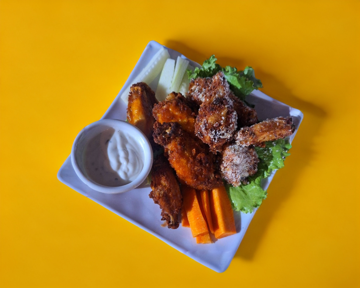 Orden de 10 alitas bañadas en la salsa de su elecciòn, acompañadas de zanahoria y pepino, incluye un aderezo ranch