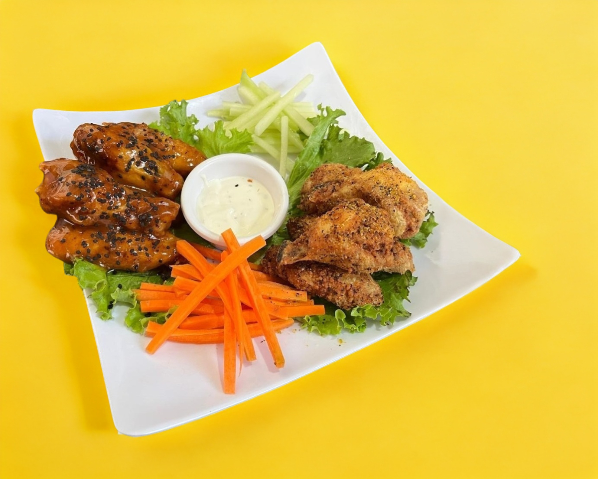 Orden de 6 alitas fritas bañadas en la salsa de su elecciòn incluye un aderezo ranch