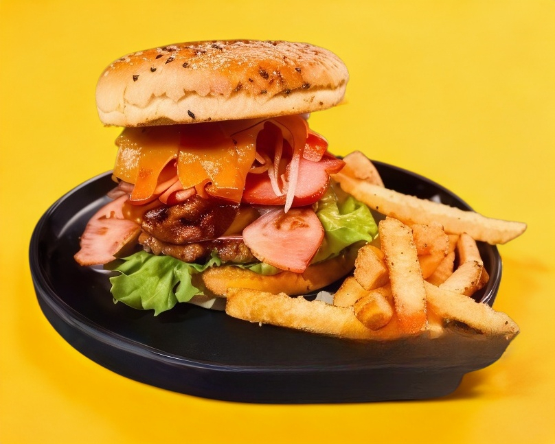 Hamburguesa con tocino y queso, incluye papas a la francesa 200 g