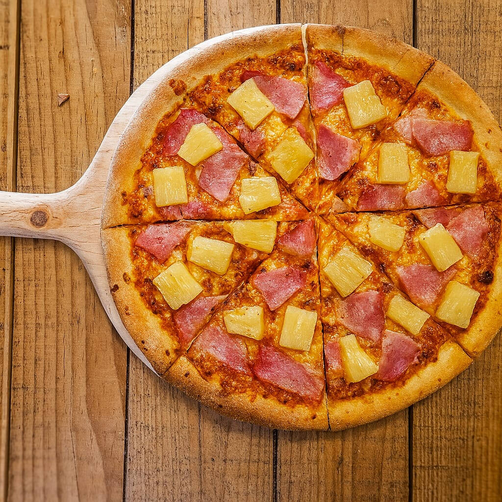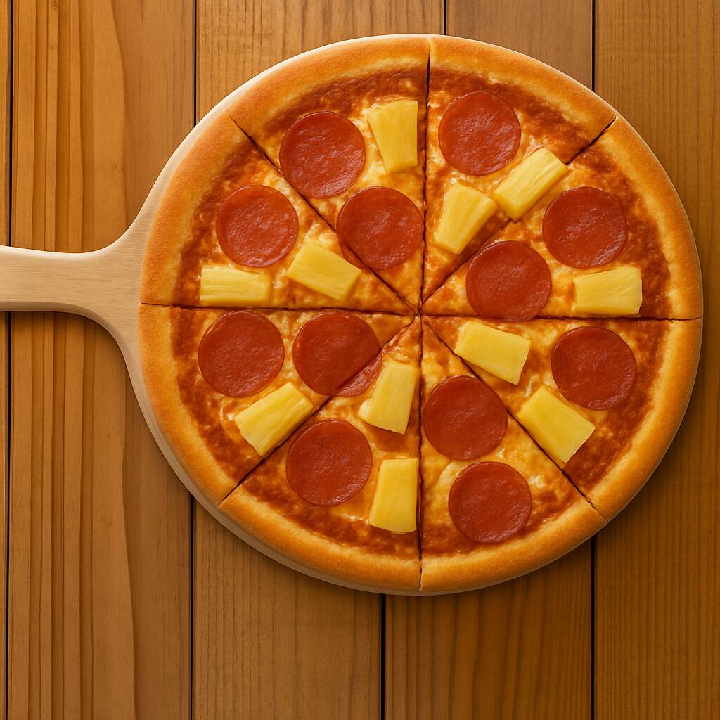 Salsa de tomate , queso mozarella , pepperoni y piña