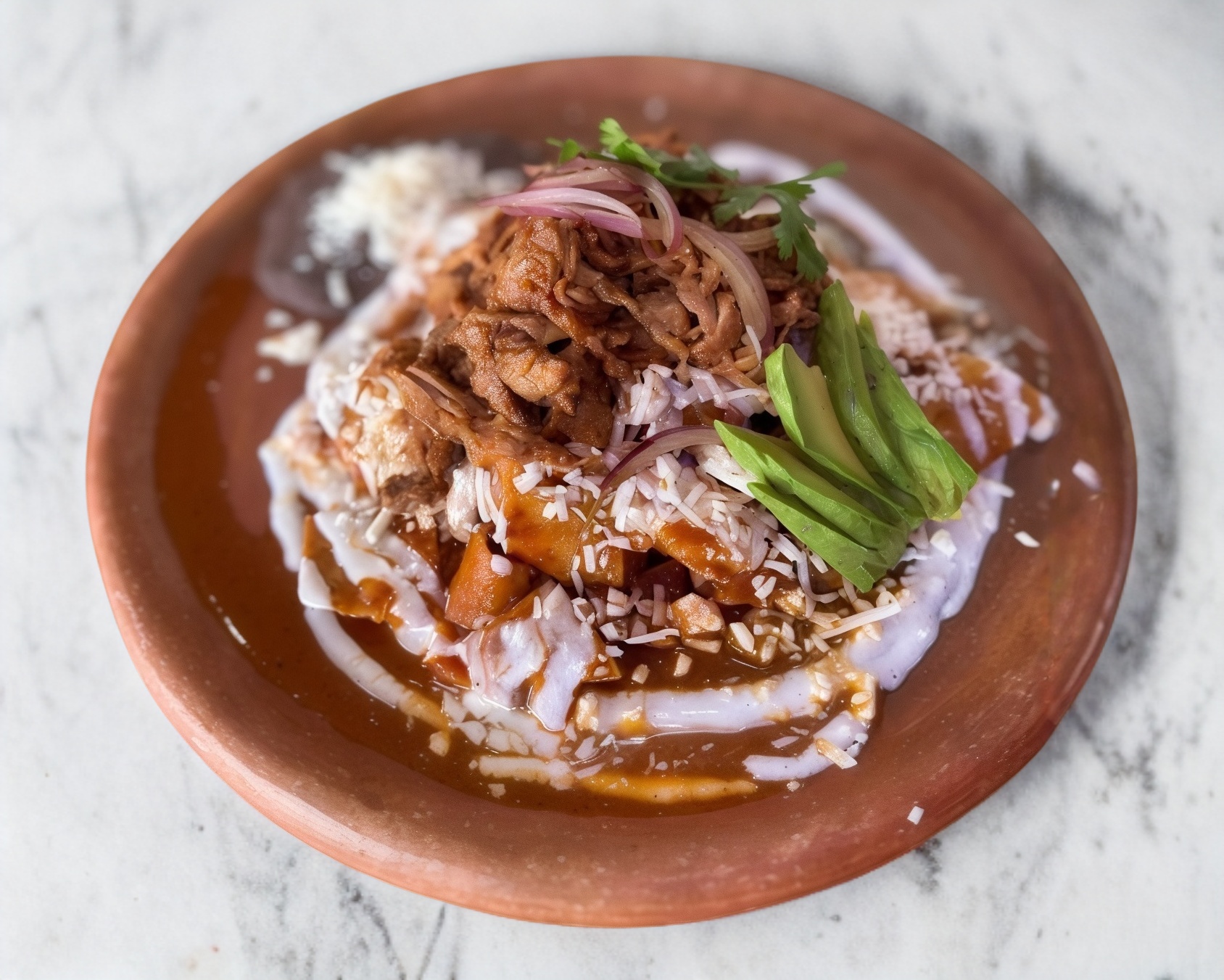 Chilaquiles tradicionales con salsa de morita, crema, queso cincho, barbacoa de res, cilantro y cebolla caramelizada.
