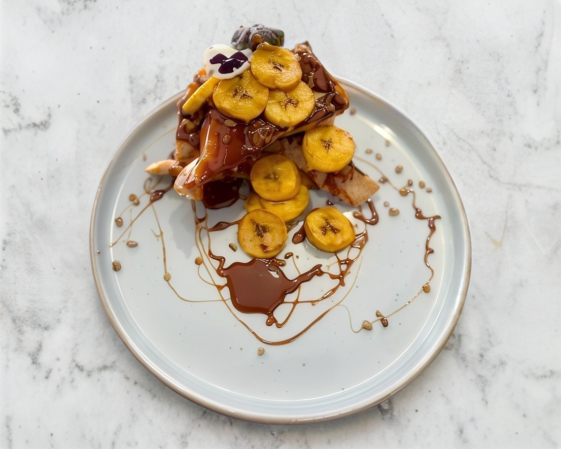 Pan de masa madre con trocitos de plátano, bañado en macho frito nuez caramelizada y cajeta.