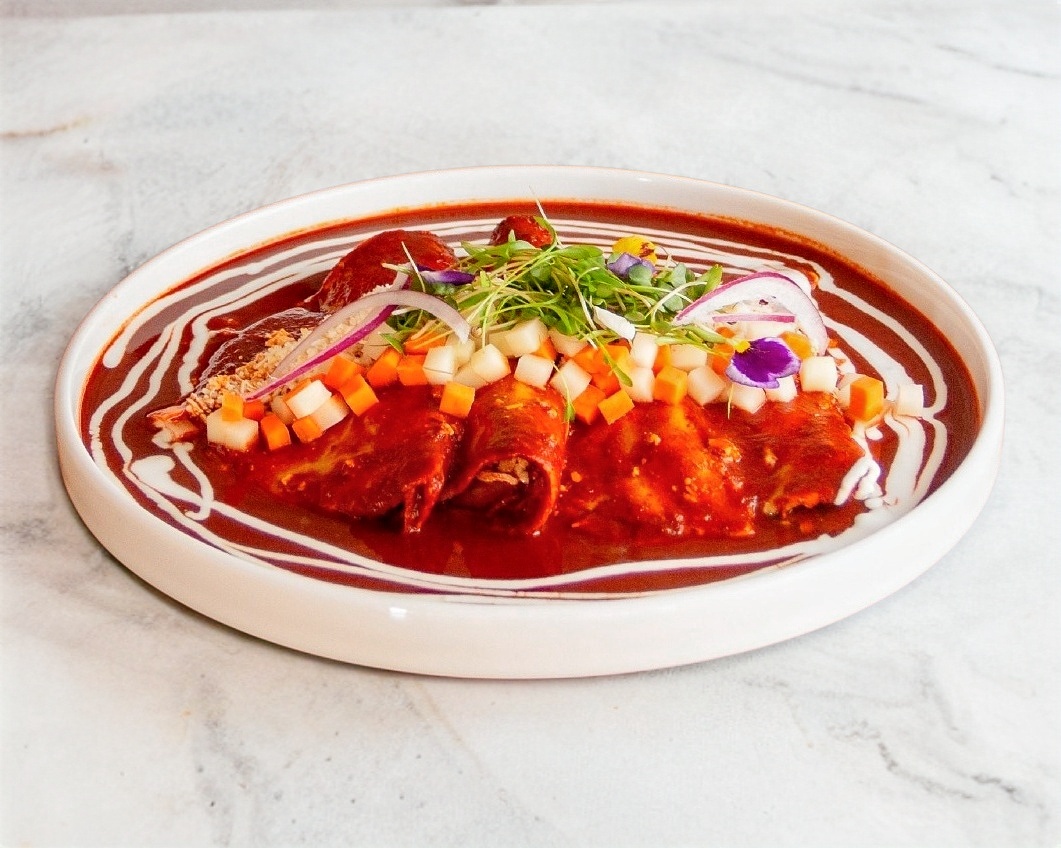 Rellenas de queso oaxaca, bañadas en salsa guajillo, crema, queso cincho, cebolla morada y verdura salteada.