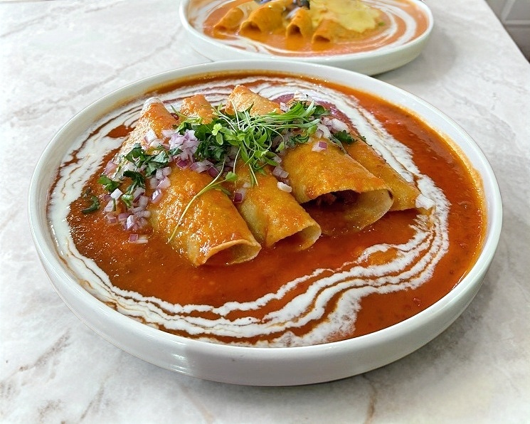 Con tortilla de maiz azul rellenas de longaniza bañadas en salsa roja ranchera, gratinadas con manchego, cebolla morada.