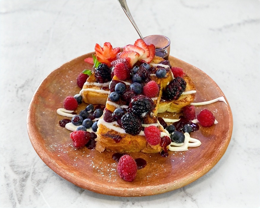 Acompañado de miel de maple, crema batida y frutos rojos.