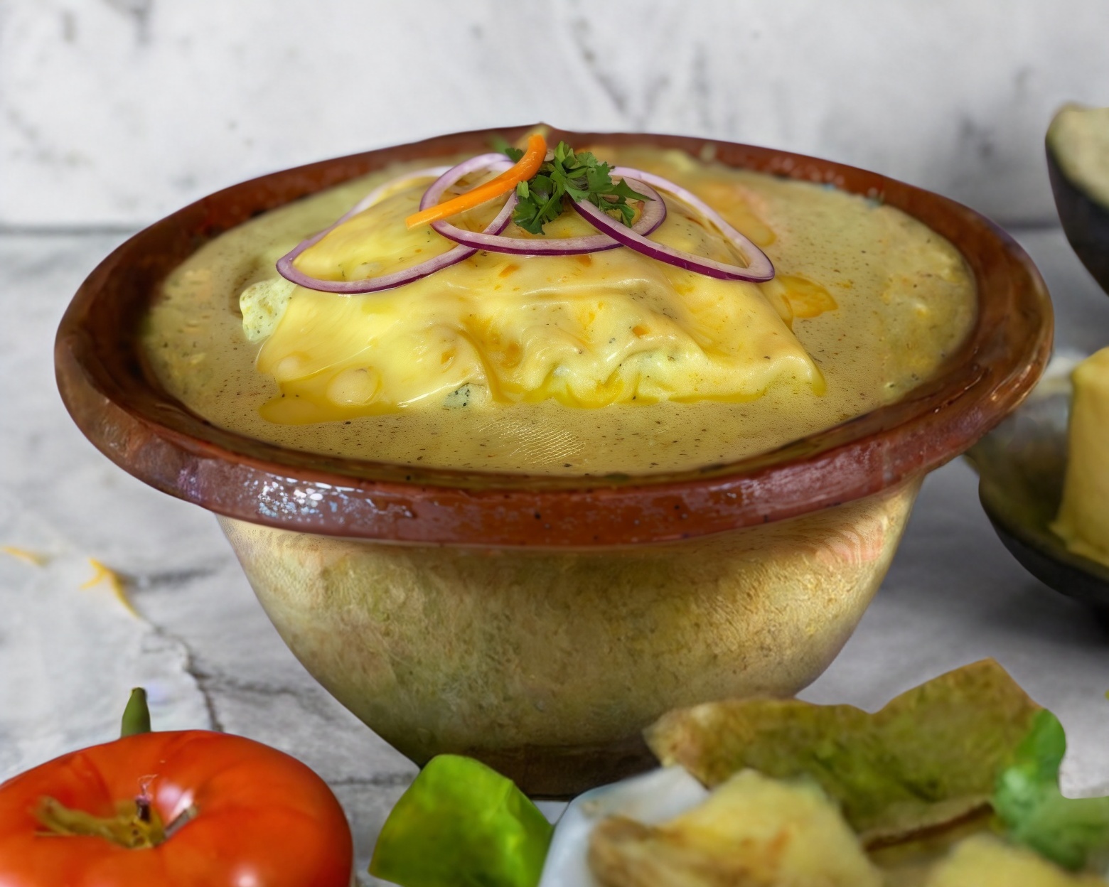 Rellenas de pollo, bañadas en salsa cremosa, gratinadas con manchego, cebolla morada y toque de cilantro.