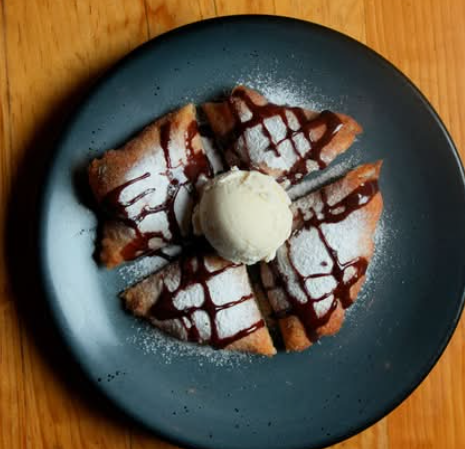 Deliciosas bolitas de masa de pizza fritas, espolvoreadas con azúcar glass bañadas con salsa de chocolate.