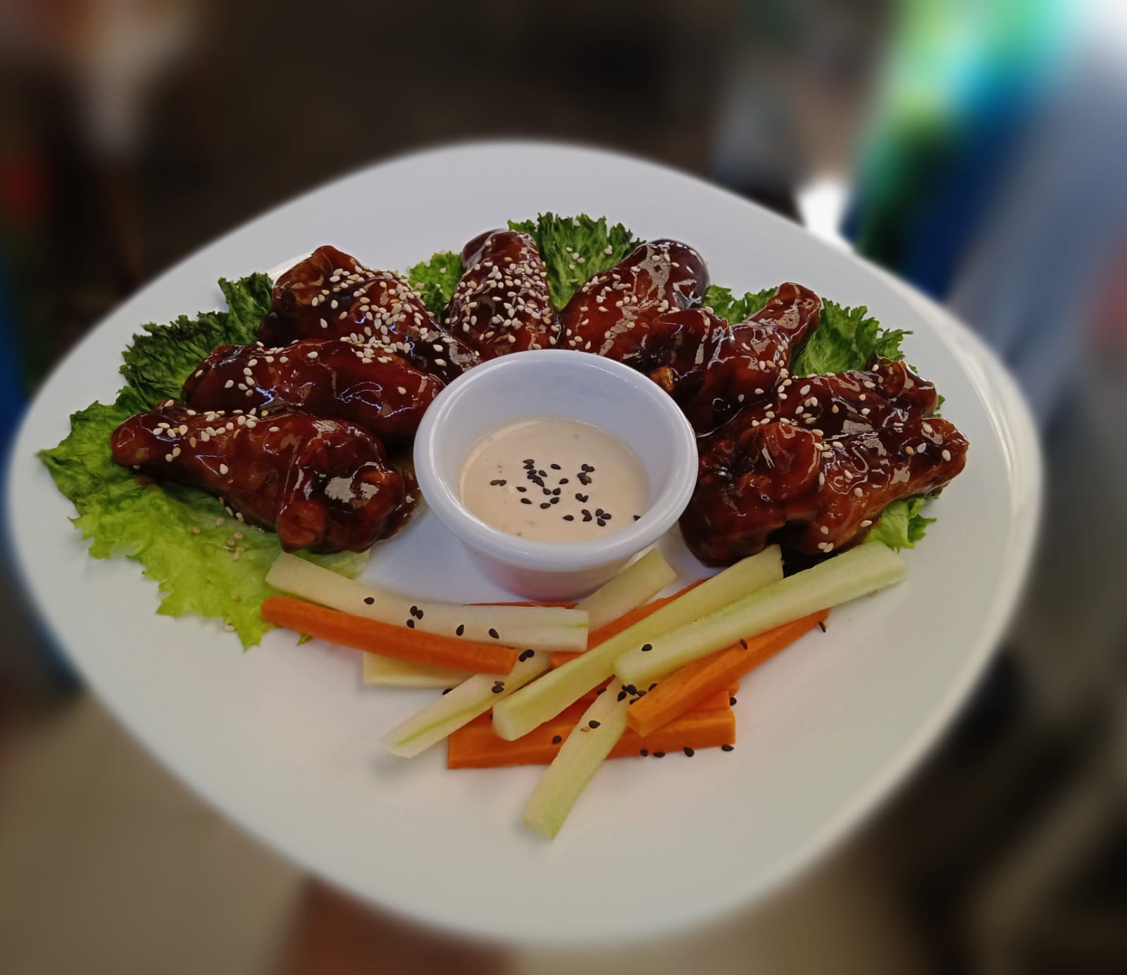 Nuestras crujientes alitas bañadas en tu salsa favorita.