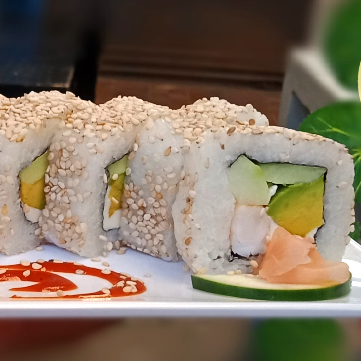 Camarón, aguacate, pepino, queso crema. Cubierto de sésamo tostado.