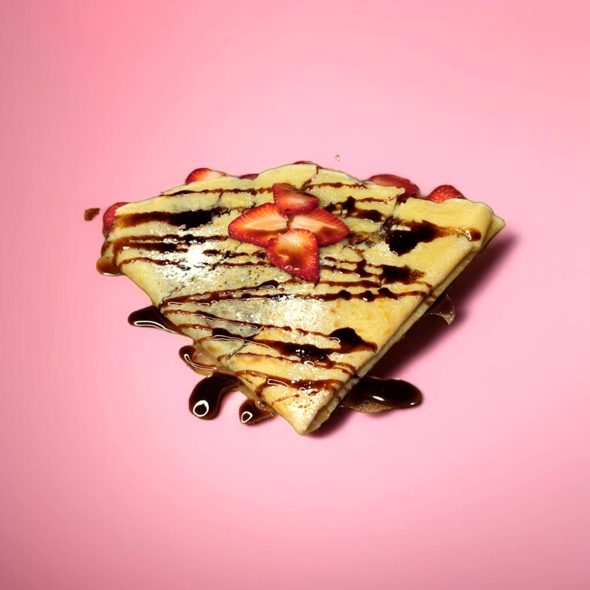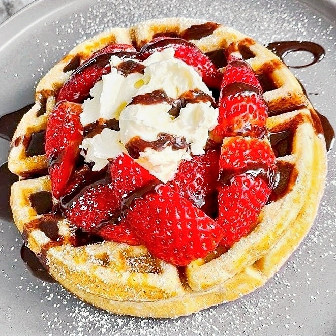 Waffle Dulce Tradicional con base de chocolate, o jarabe de maple y topping de fresa